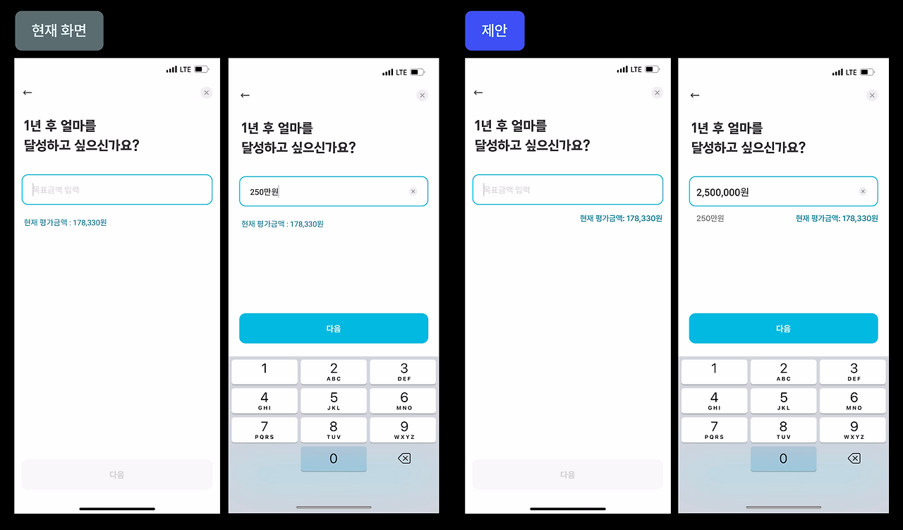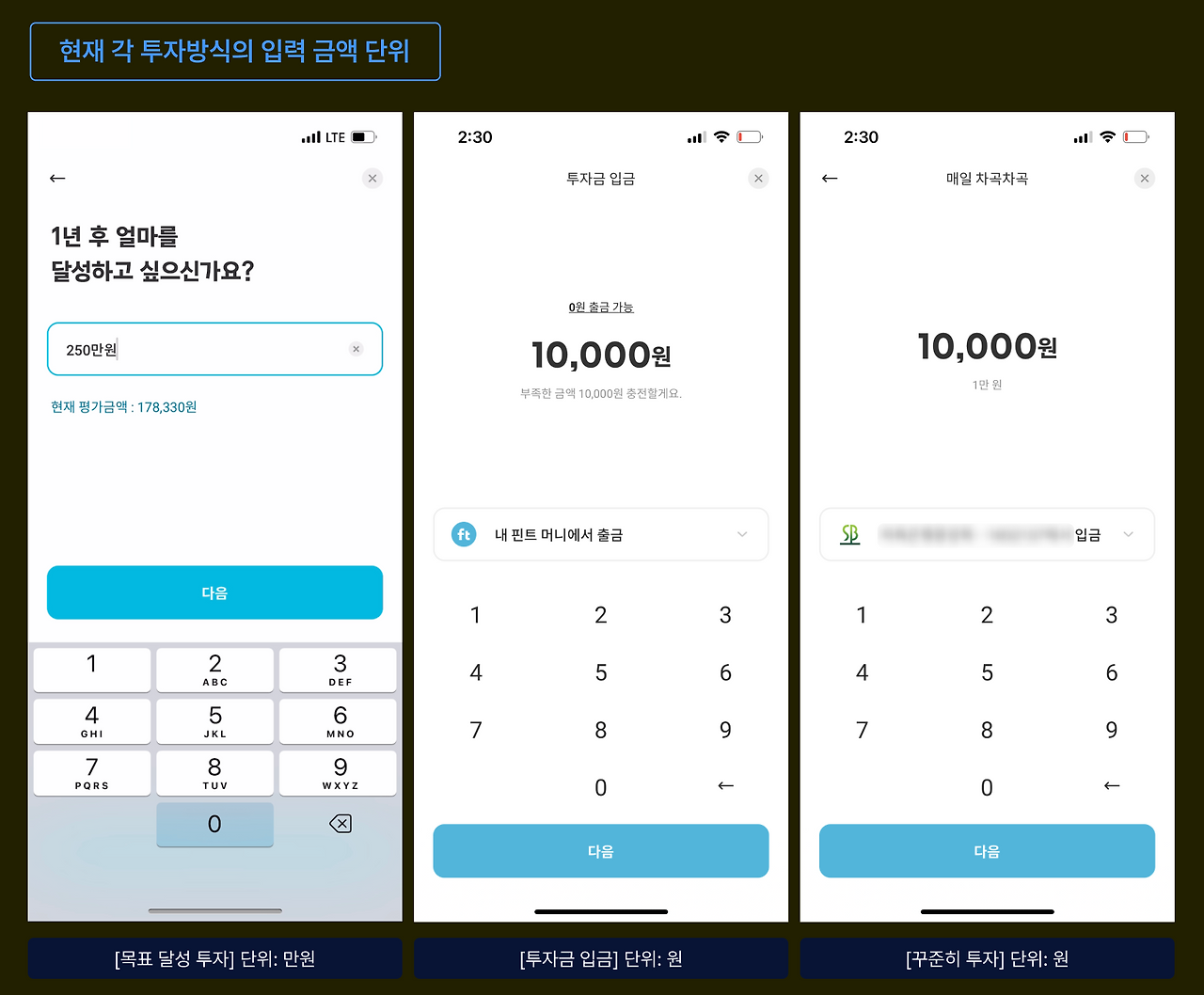 1년 단위 목표금액이기 때문에 상대적으로 금액이 큰 만큼 사용자가 0을 덜 누르도록 편의를 위해 의도적으로 이렇게 만든 것 같다. 하지만 개인적으로는 투자금 (직접)입금, 꾸준히 투자 등 다른 화면들에서는 1원 단위로 숫자를 눌렀어야 했기 때문에, 단위가 통일되지 않아 오히려 헷갈렸다.