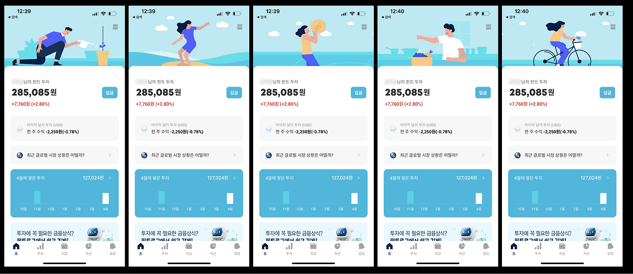 친근한 이미지를 주고 앱을 동적으로 보이도록 하기 위한 장치인 듯하다. 처음 봤을 때는 금융앱 치고 디테일에 신경 쓴 점 + 서비스가 동적으로 느껴져서 좋았으나, 같은 동작이 계속해서 반복되어 노출되다 보니 약간의 피로감이 생긴다. 앱을 다시 구동하기 전까지는 다른 탭으로 전환했다가 홈화면으로 돌아와도 같은 애니메이션이 유지되는데, 직전과 다른 애니메이션을 노출하는 것도 방법 중 하나일 듯.