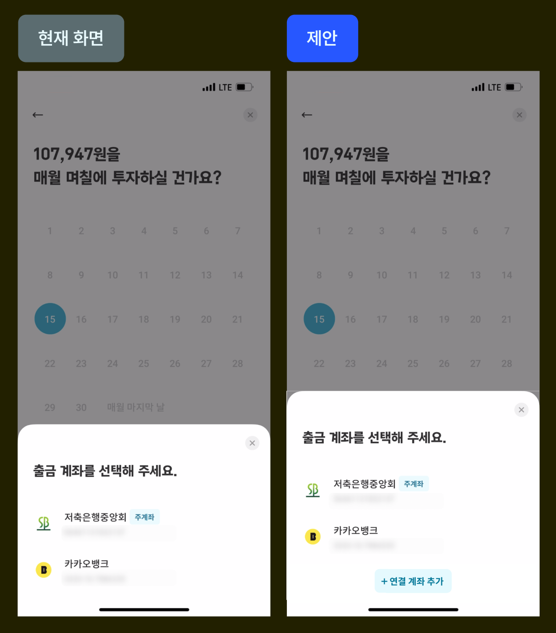 목표 달성 투자 플로우 종료 > 홈화면으로 나가 각 탭들을 누르며 연결계좌를 찾다가 > 우측 상단 더보기 버튼 발견 > 연결계좌 버튼 통해 연결계좌 추가 > 다시 목표 달성 투자 플로우 진입 > 아까 입력했던 모든 옵션들 다시 입력 > 새로 추가한 계좌를 선택해 목표달성투자 플로우 완료