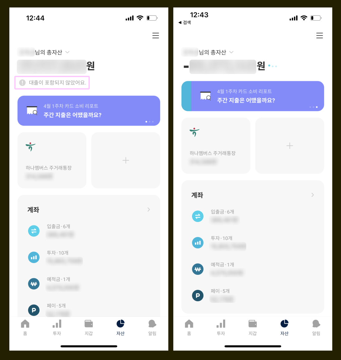 현재는 금융사를 연결하는 방법으로만 자산을 집계하는 듯하다. 하지만 자산 연결 없이도 현금 자산을 직접 입력할 수 있으면 좋을 것 같다. 예를 들어, 전세대출 같은 경우 이미 상환한 금액과 대출액이 섞여있는데, 자산 연결 시 대출 금액은 집계되지만 상환한 금액에 대해서는 자산에 추가할 수 없음.