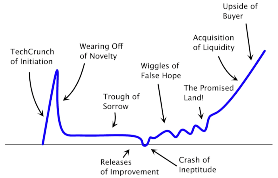 • 출시 에너지(오픈빨)는 결국 사그라들기 시작한다. 얼리 어답터들은 늘 새로운 것을 찾고 있기 때문. 대부분 즉각적인 높은 리텐션을 가지지 못하기 때문에 제품은 슬픔의 통로로 들어가기 시작한다. 이 시간은 오래 걸릴 수 있는데, 많은 회사들이 이 단계에서 죽는다. 그들은 그냥 포기한다. 새로운 것들을 테스트하기 위해 충분히 빠르게 움직이지 않는다.
