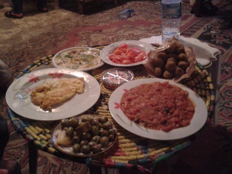 사진의 가장 위쪽 접시에 담긴 붉은 것은 생 토마토, 오른쪽 방향으로 펠라펠(콩을 으깨어 약간 매콤하게 양념을 한 반죽을 동그랗게 튀긴 음식), 자작하게 졸인 토마토 야채 소스, 올리브 초절임, 계란 프라이, 후무스(콩을 갈아 마늘과 레몬으로 양념을 한 소스)이고, 가운데 놓인 동그란 것은 낱개 포장이 된 치즈다. 여기에 따뜻하게 구운 피타(얇고 넙적한 빵)가 곁들여졌는데 피타를 조금씩 뜯어 각자 입맛에 맞게 재료들을 얹어서 먹었다. 밤늦게 먹어도 전혀 부담되지 않는 건강한 저녁 식사였다.