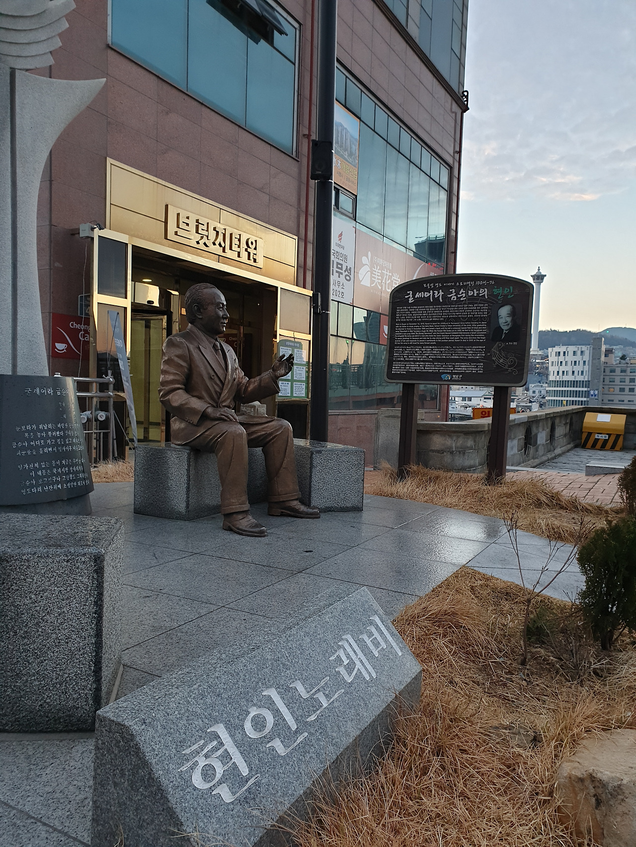 영도다리 입구에 노래하는 동상, 현인 노래비가 있어요. 어느 날 현인 노래비 앞은 지나는데요, 할아버지 한분이 현인 동상을 꼭 안으시고는 한참이나 노래를 듣고 계시더라고요.