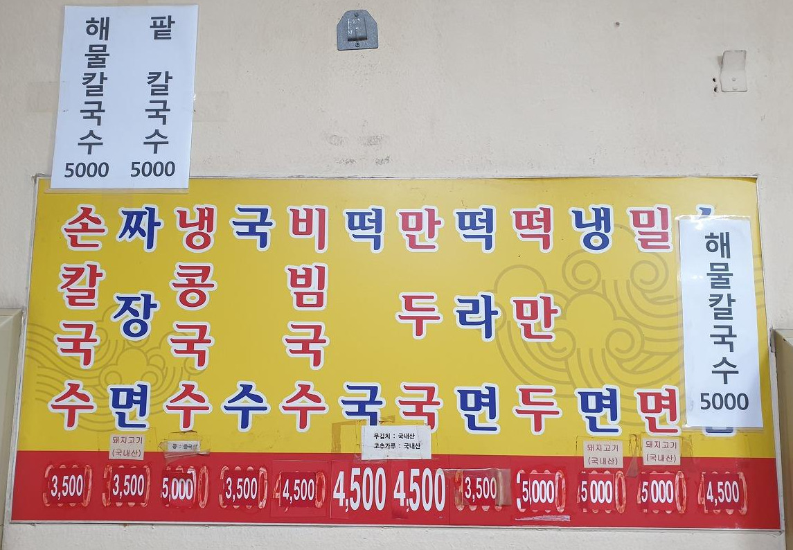 칼국수뿐만 아니라, 짜장면, 떡국, 냉면 등등 다양한 음식들이 있어요. 가격이 참 착하지요?