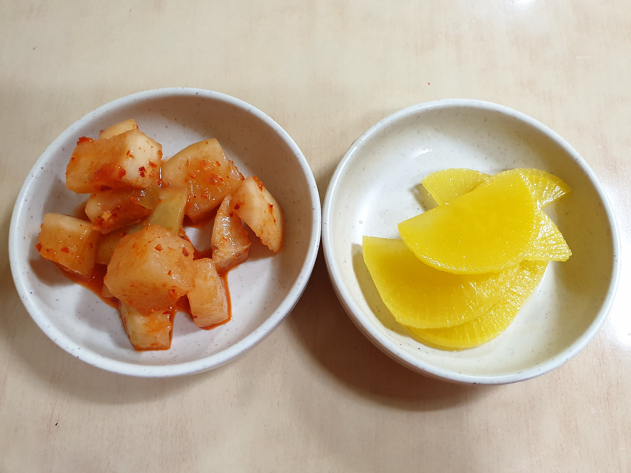 단무지와 깍두기가 기본 반찬이에요.