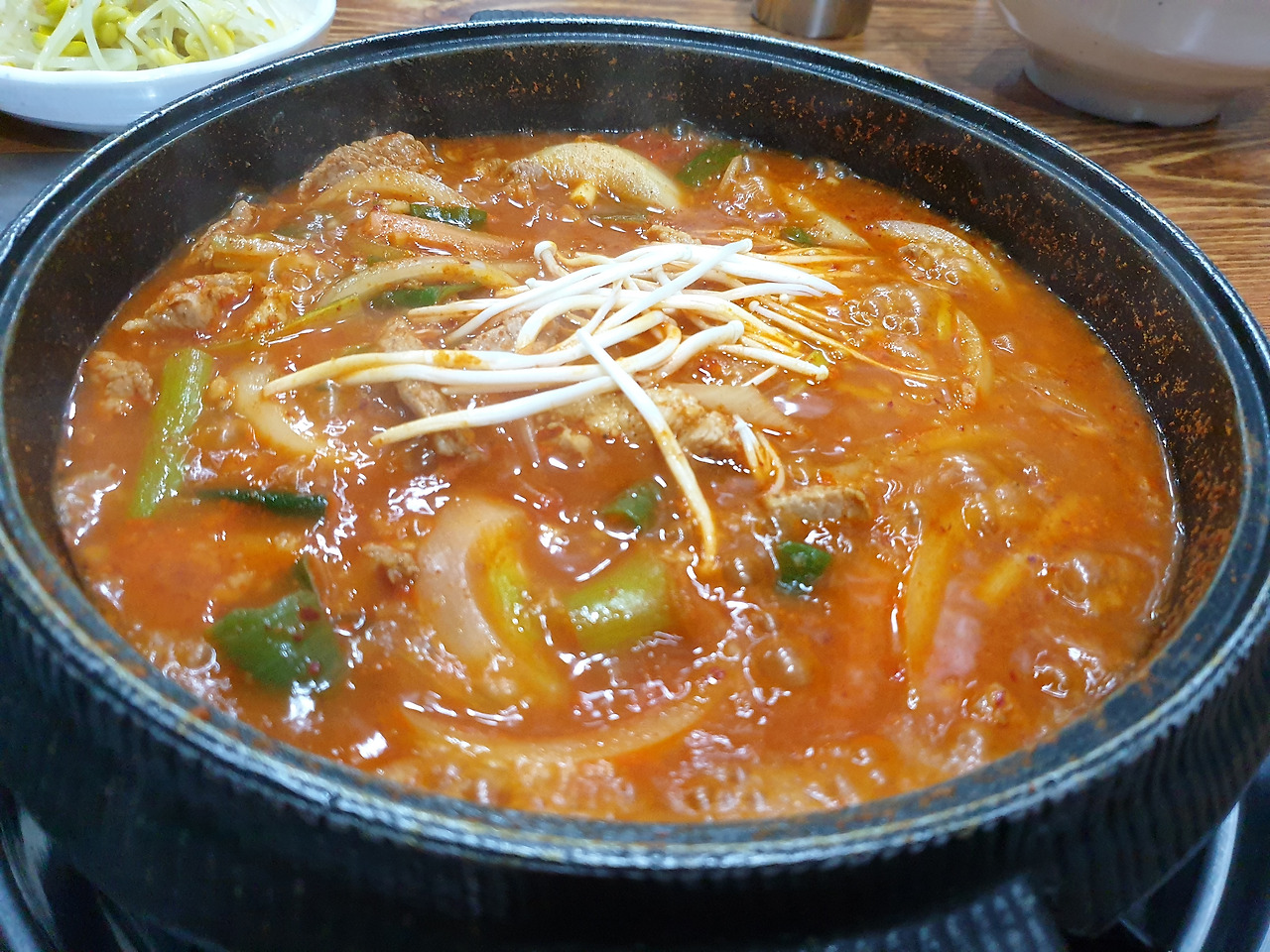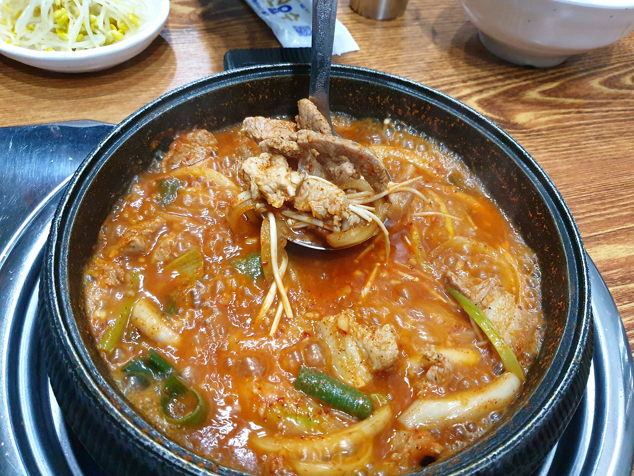 돼지고기 듬뿍 들어간 김치찌개 같은데요, 김치는 없고요, 자글자글 자작하게 졸여서 먹는 매콤한 돼지찌개였어요.