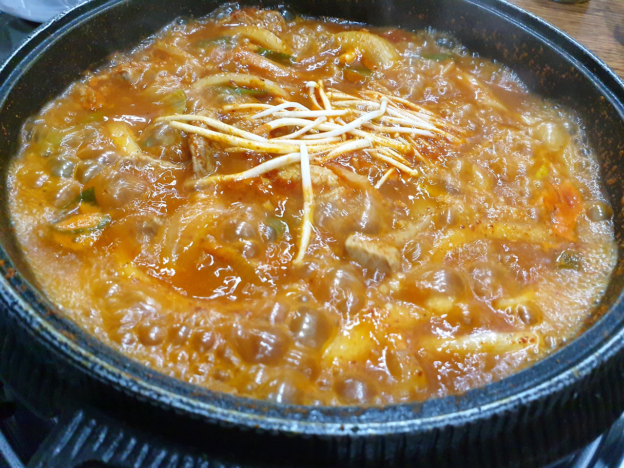반찬들을 사진 찍으며 카메라에게 먼저 반찬을 먹이고 있다 보니 어느새 짜글이 찌개 나왔습니다. 이번에도 카메라님이 먼저 드셔야지요?