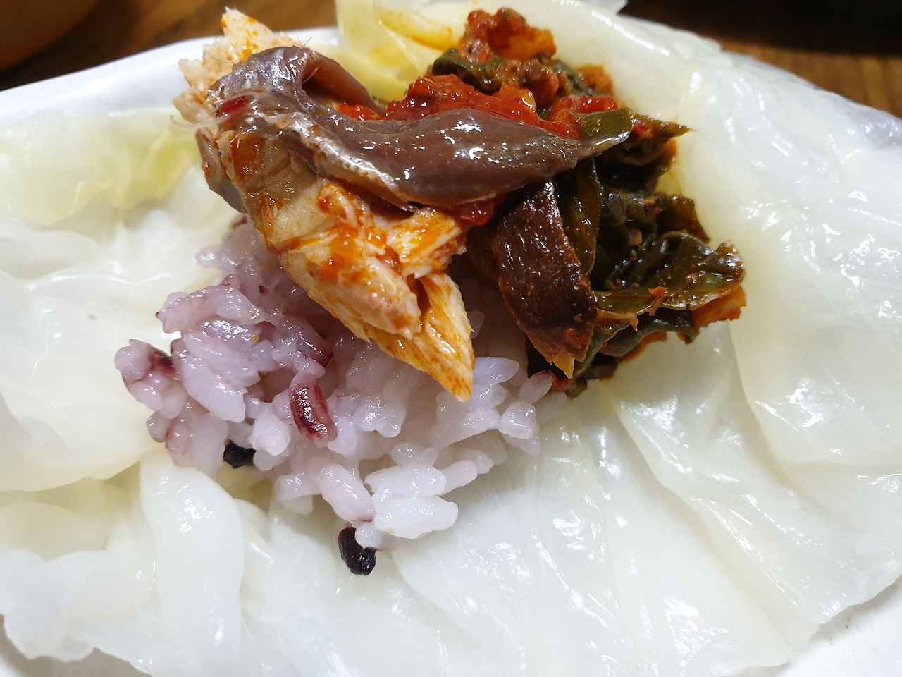 쌈 야채 위에 밥 한 술 뜨고, 고등어조림 한 조각에 멸치 젓갈 한 조각을 얹어 먹으면