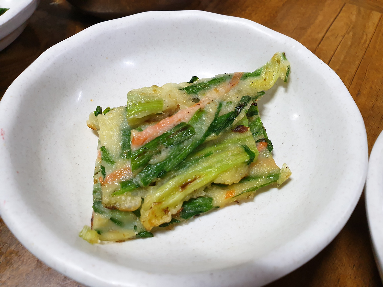 주요 밑반찬인데요, 시금치나물, 부추전, 잡채, 톳나물, 감자 샐러드, 깍두기는 기본이고요,