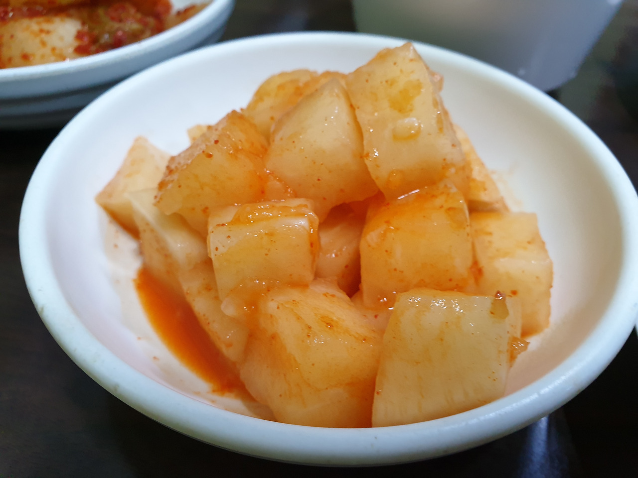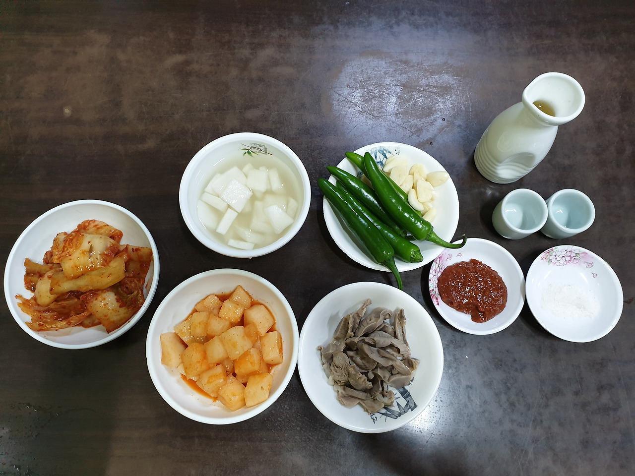 깍두기, 김치, 무 물김치, 고추와 마늘, 된장과 소금이 나와요.