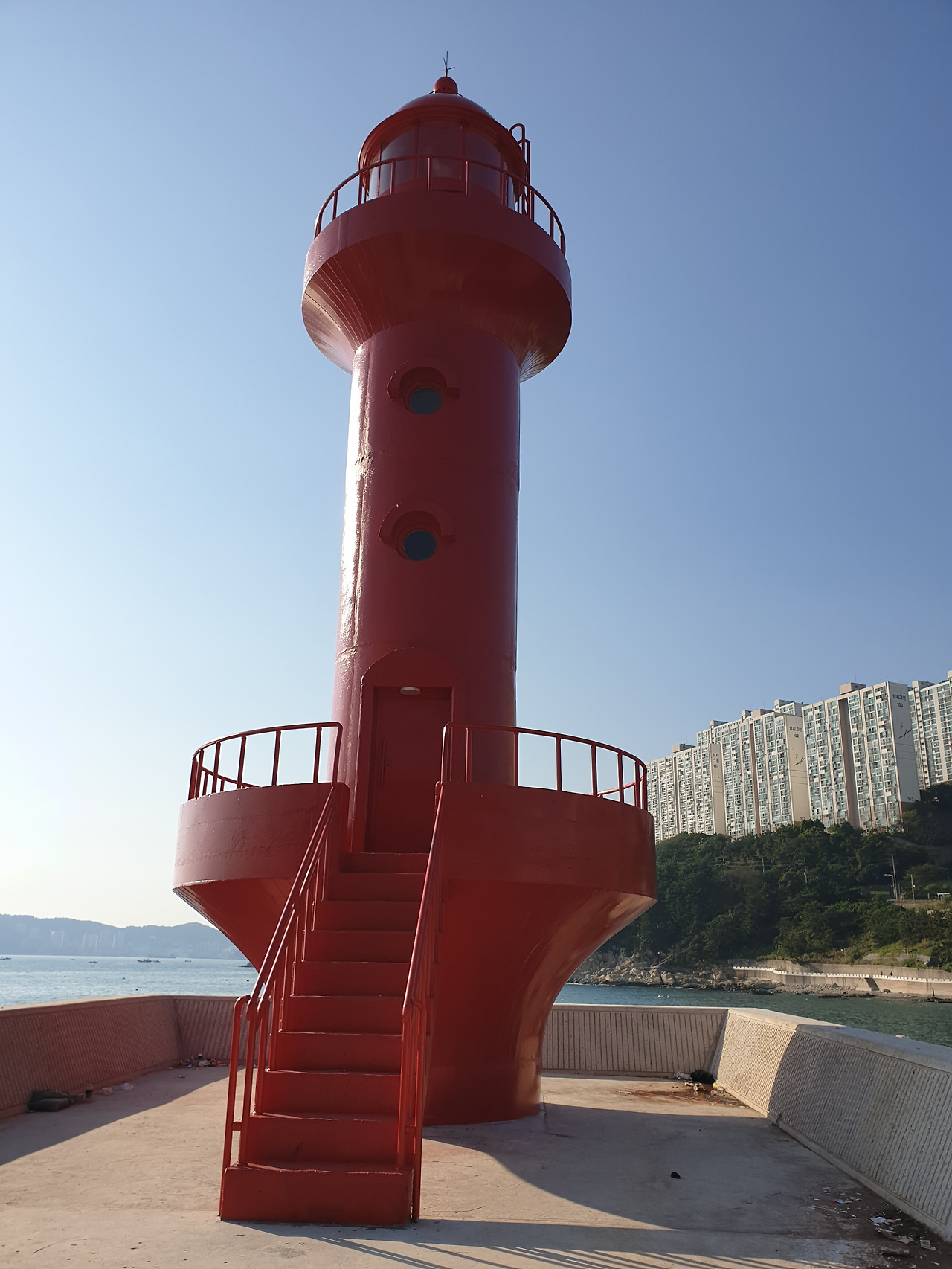 영도 절영산책로에서 흰여울 길을 택하든 해안 터널을 택하든, 중리산 해안을 만날 수 있어요. 영도 해녀촌이 있는 해안인데요, 방파제와 빨간 등대가 새롭게 들어섰지요.