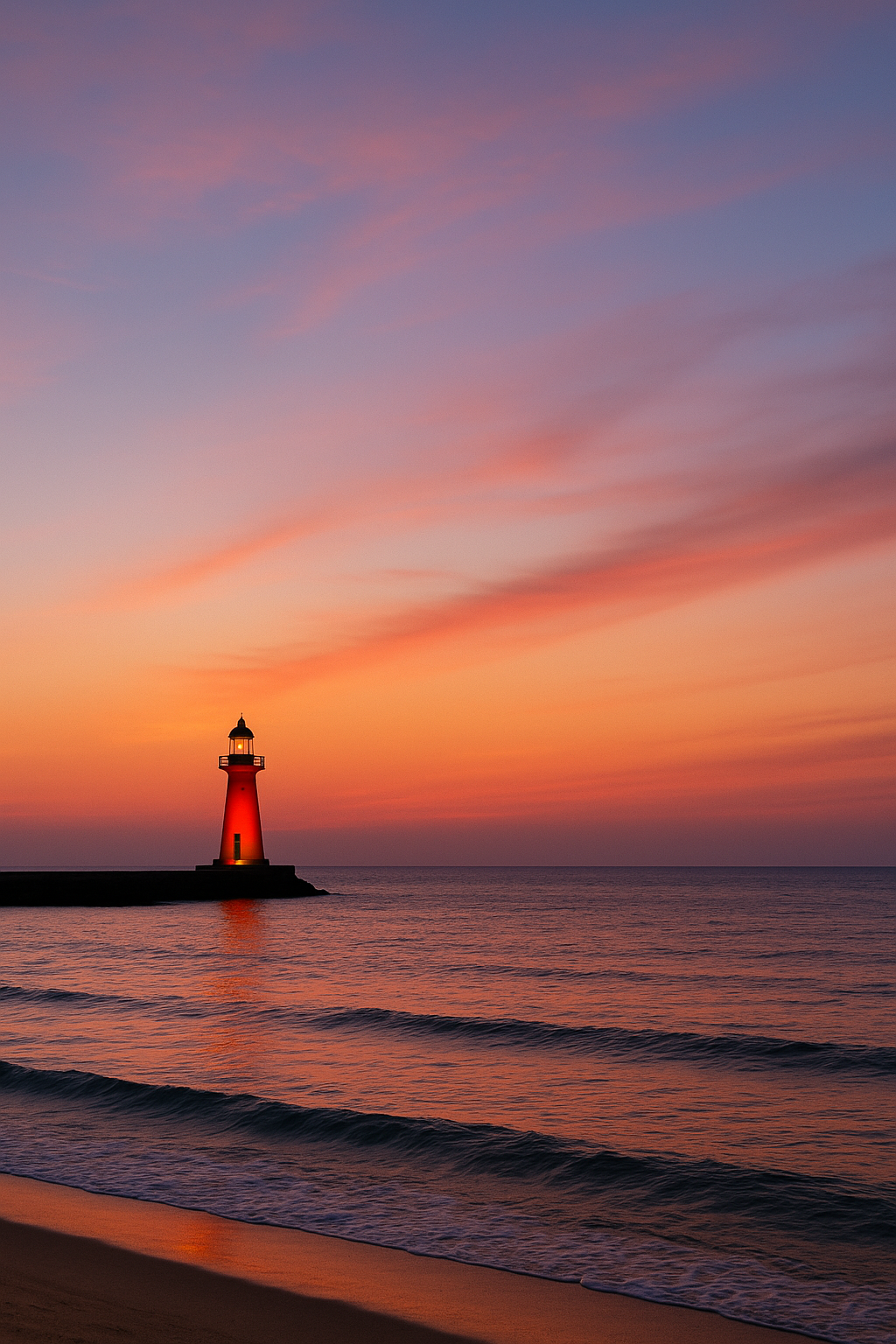 나는 대답 대신 고개를 끄덕였다. 도로 끝 붉은 등대가 보였다. 노을이 번지고, 그 빛이 바다 위 흰 거품을 스치며 서서히 스며들었다. 마치 누군가의 숨결이 하루의 끝을 붉게 덧칠하는 것처럼.