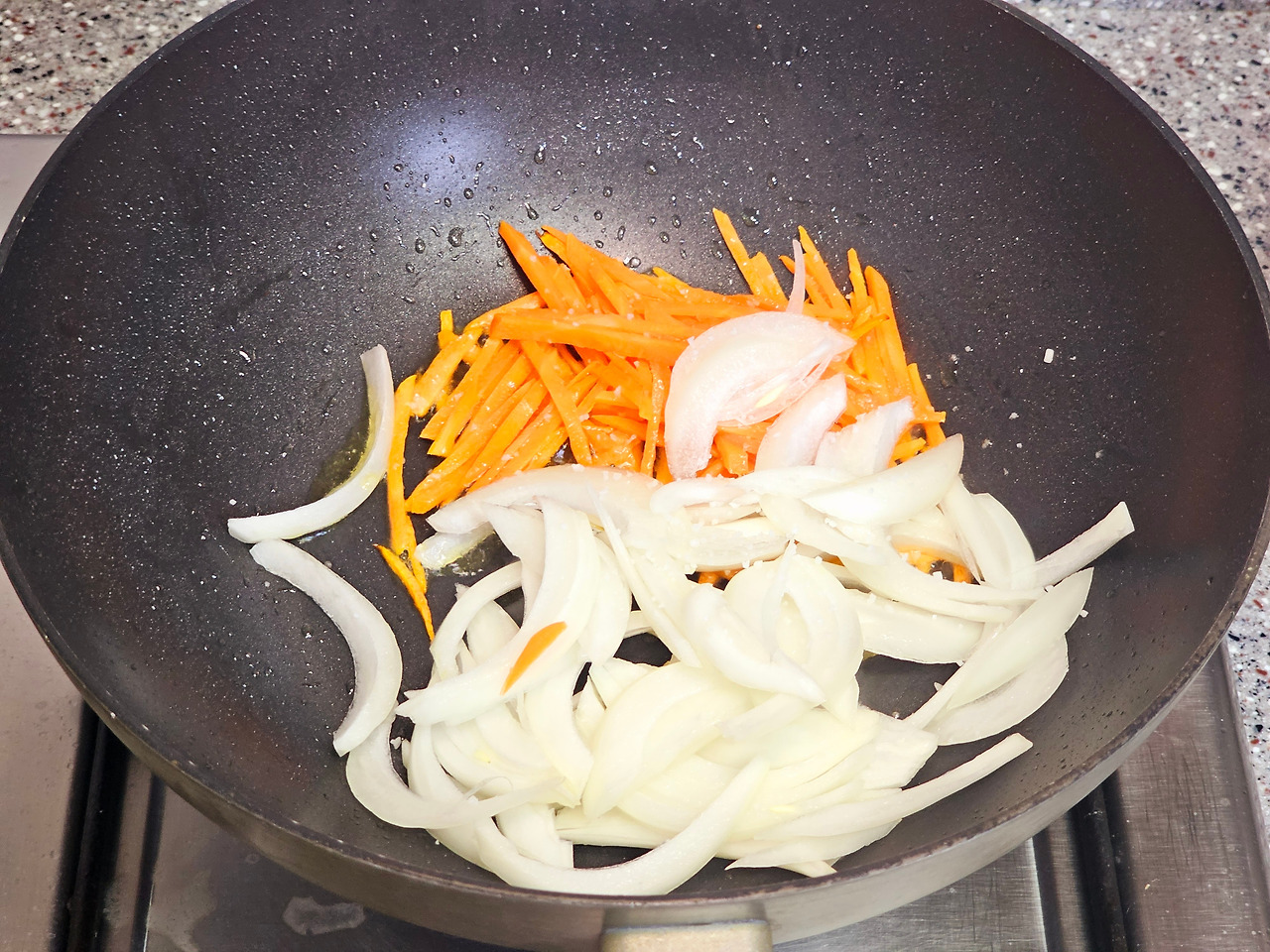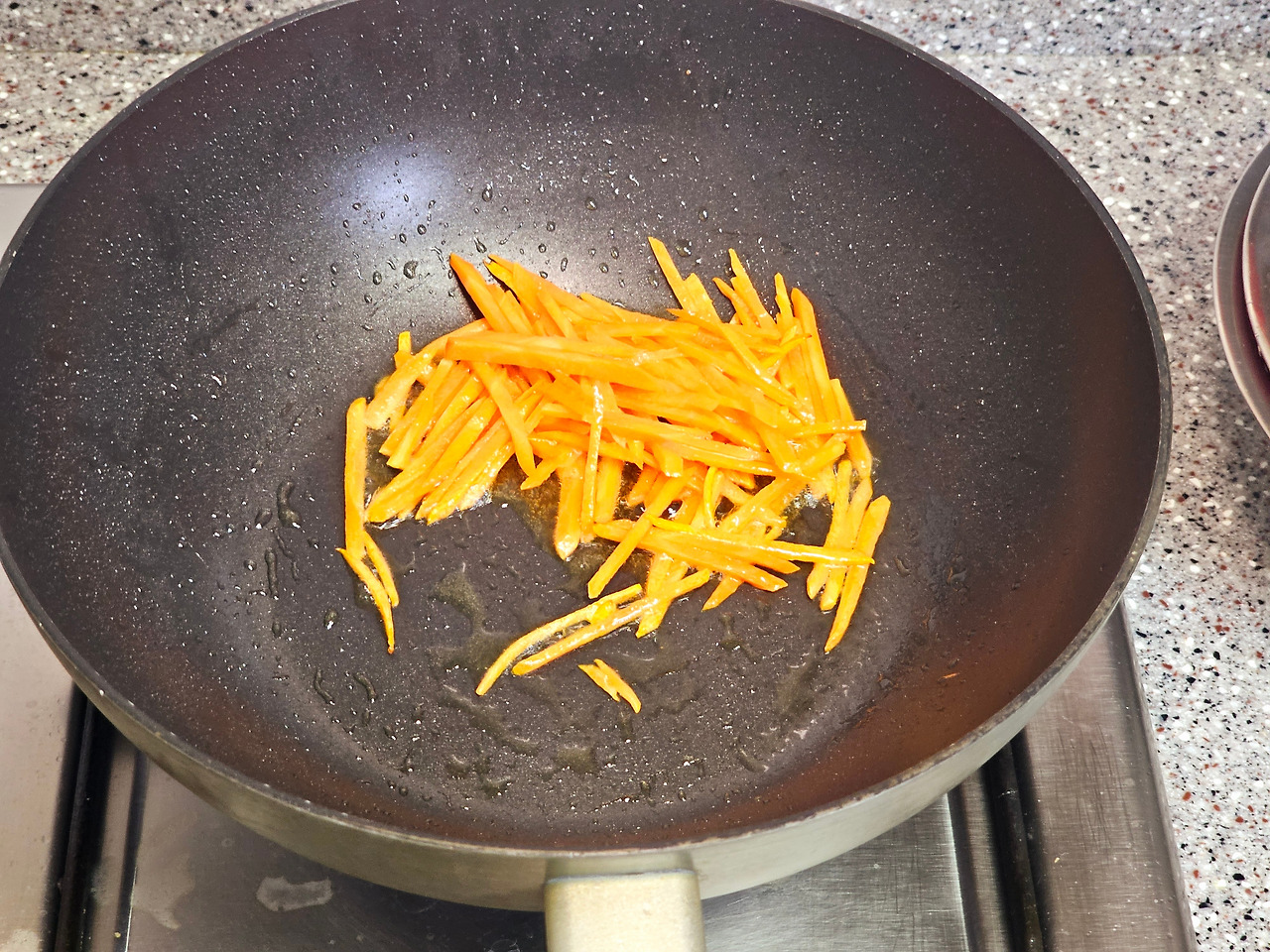 5. 예열된 팬에 식용유 1스푼을 넣고 당근부터 볶아줍니다. 30초 정도 중강불에 볶아주세요.
