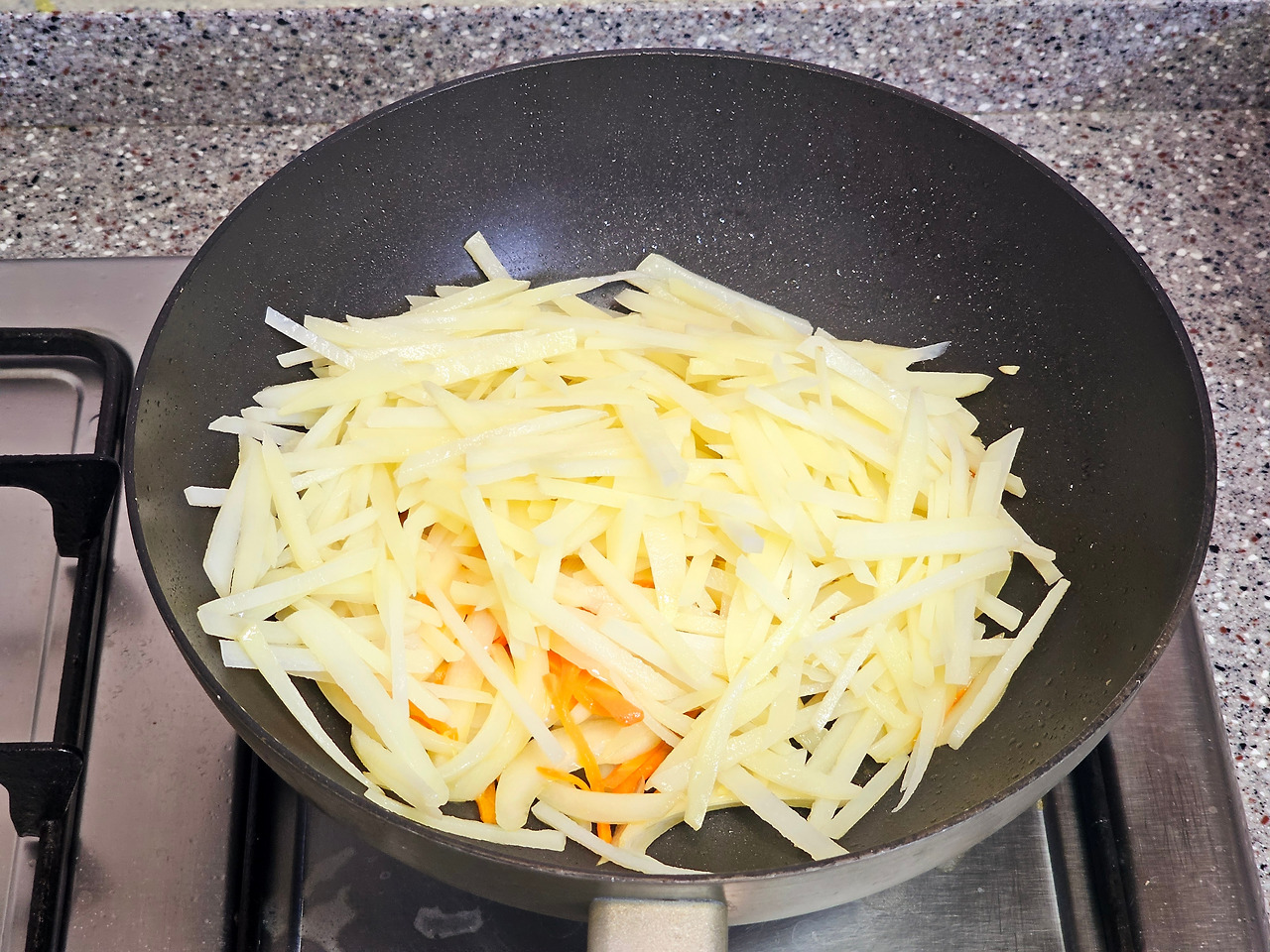 7. 식용유 1스푼을 더 넣고 물기를 빼준 감자채를 넣고 볶아주세요. 이때 소금 간을 맞춰 주시고 후추도 톡톡 뿌려주세요.