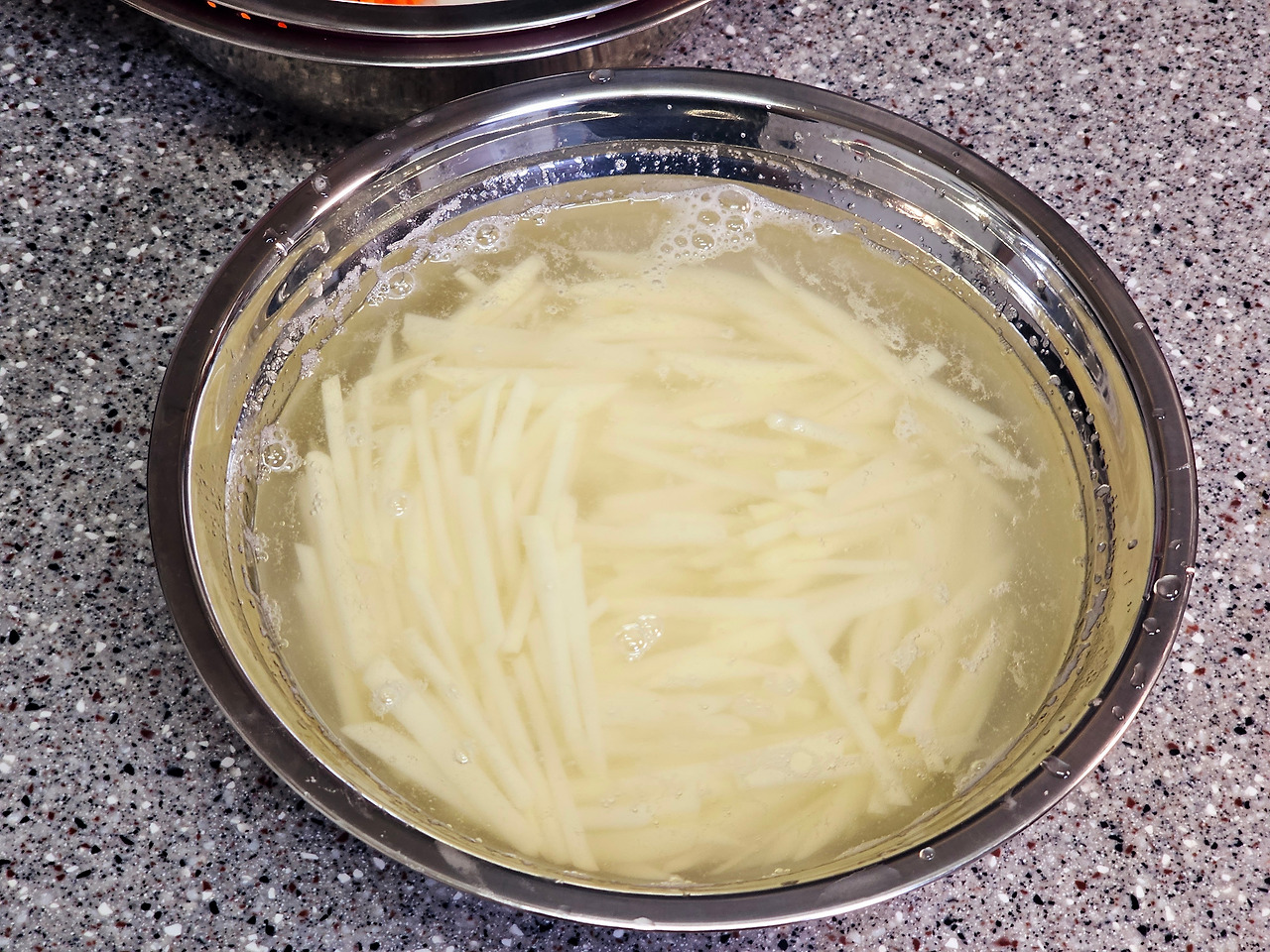 3. 채 썬 감자는 물에 담가서 1차로 전분기를 없애 주고 갈변도 막아줍니다.