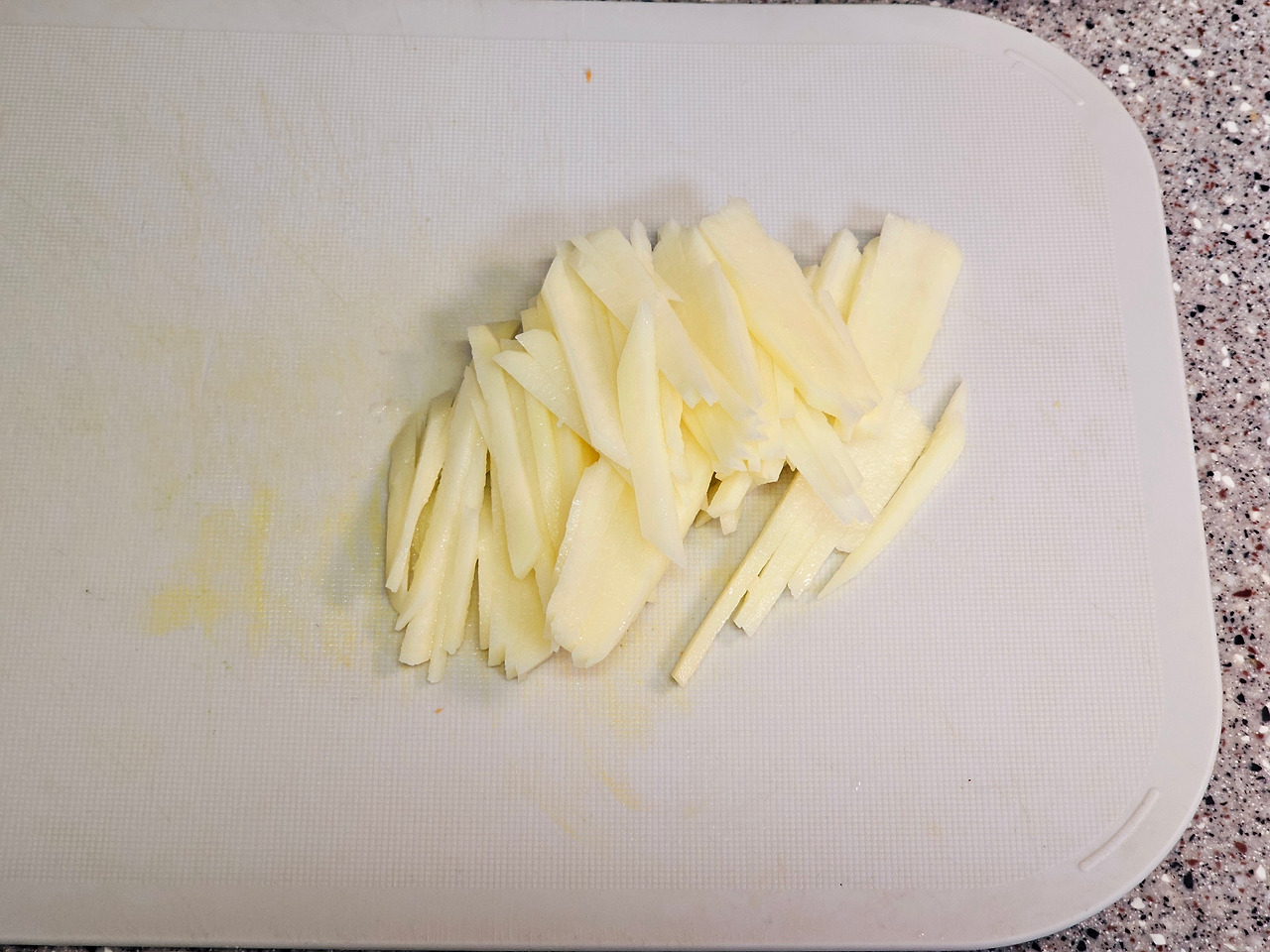 어머니께서 만들어 주시던 감자채는 전분기가 어우러져서 약간 끈적이는 음식이 만들어지는데요. 저는 오히려 그 식감이 좋아서 되도록 물에 헹궈내지 않고 볶습니다.