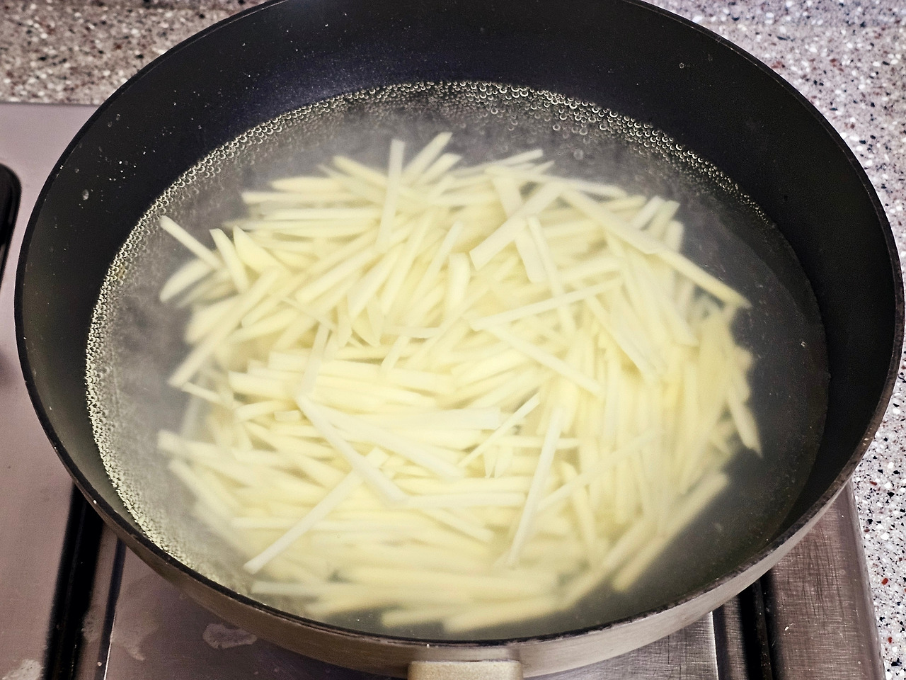 4. 채 썬 감자는 소금 1작은술 넣은 끓는 물에 넣고 1분 정도 데쳐줍니다.
