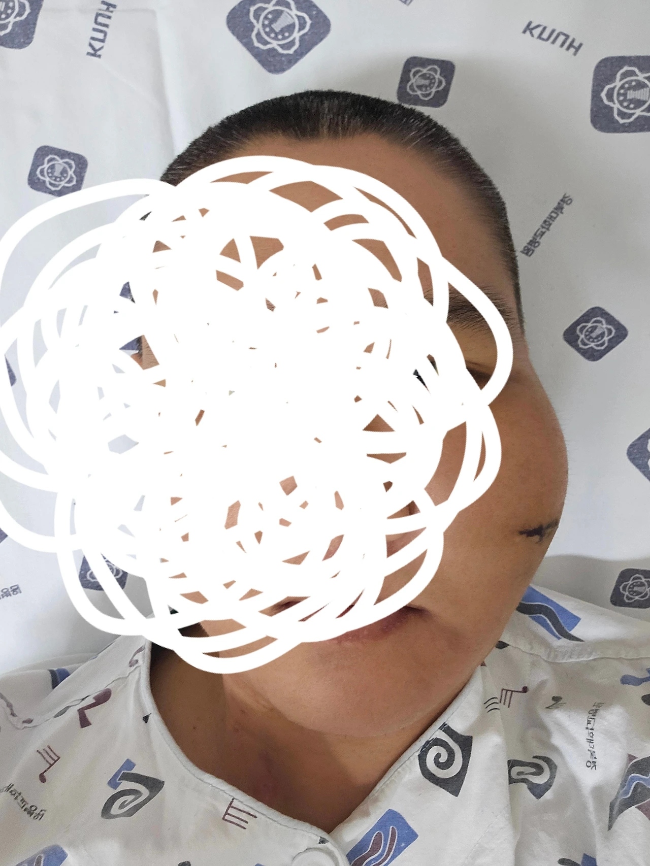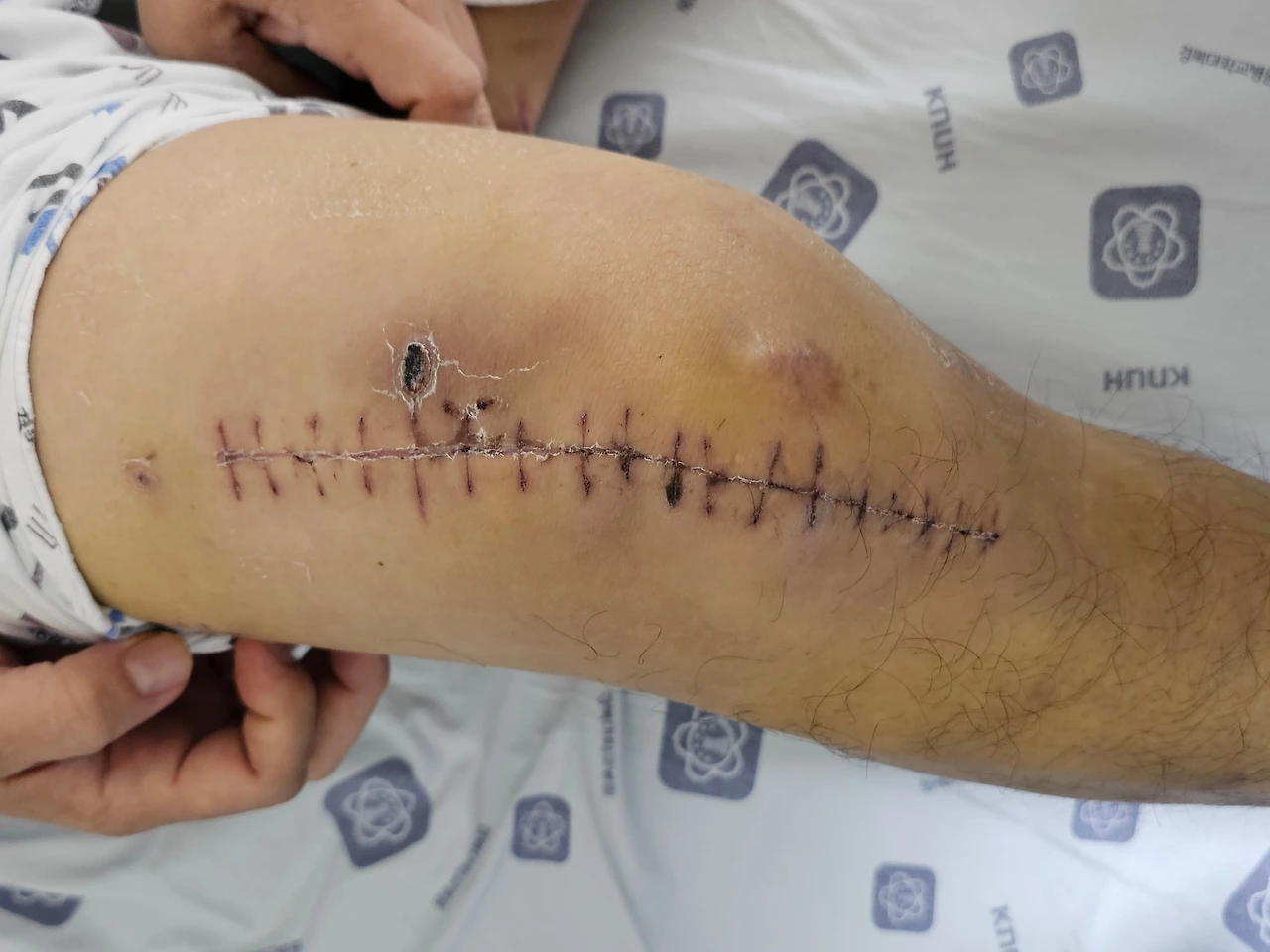 수술부위는 세 군데, 허벅지 대퇴골 수술, 오른쪽 눈 밑 안와골절 수술, 턱 골절 수술. 날짜를 나눠서 진행하지 않고 다행히도 마취 한 번에 수술을 받았습니다.