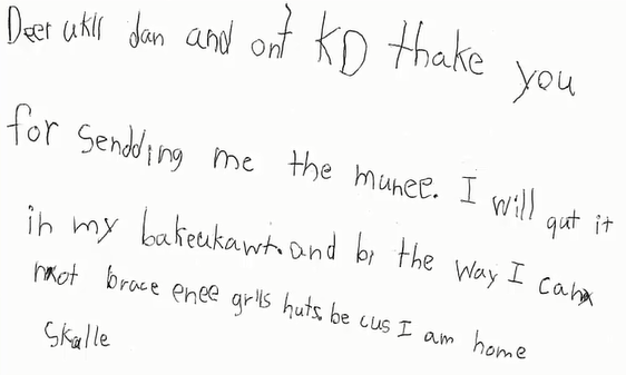 난독증 예시. 초등학교 3학년. 철자를 틀리게 썼다. 어떤 것은 소리 나는 대로 쓰기도 했다. p를 q로 바꾸어 쓰기도 했다. 대문자로 써야 할 곳을 소문자로 썼다. 쉼표와 마침표를 적절히 쓰지 않았다.