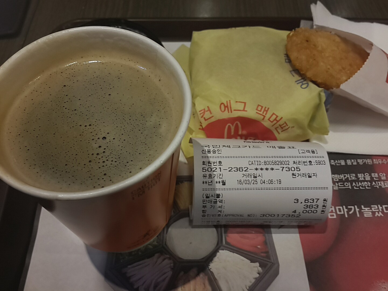 오늘은 특별한 날이기에 아메리카노만 시키지 않고, 맥모닝 세트도 주문하여 아침식사를 하였다. 햄버거를 그렇게 좋아하지 않지만 오늘은 왠지 맛있다.