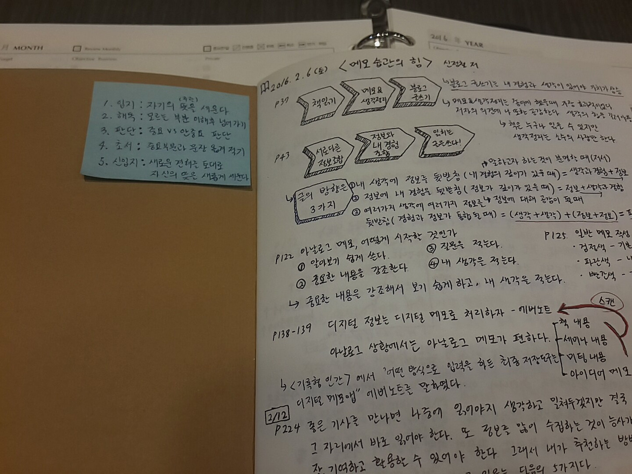 <메모 습관의 힘>을 보고, 묶여있는 얇은 노트(복면사과 까르네)에 기록하기 시작했다. 기록은 그 동안 디지털 도구로 에버노트, 씽크와이즈, 책꽂이+에 아날로그 도구로는 시스템 다이어리 3P바인더에만 기록을 했었다.