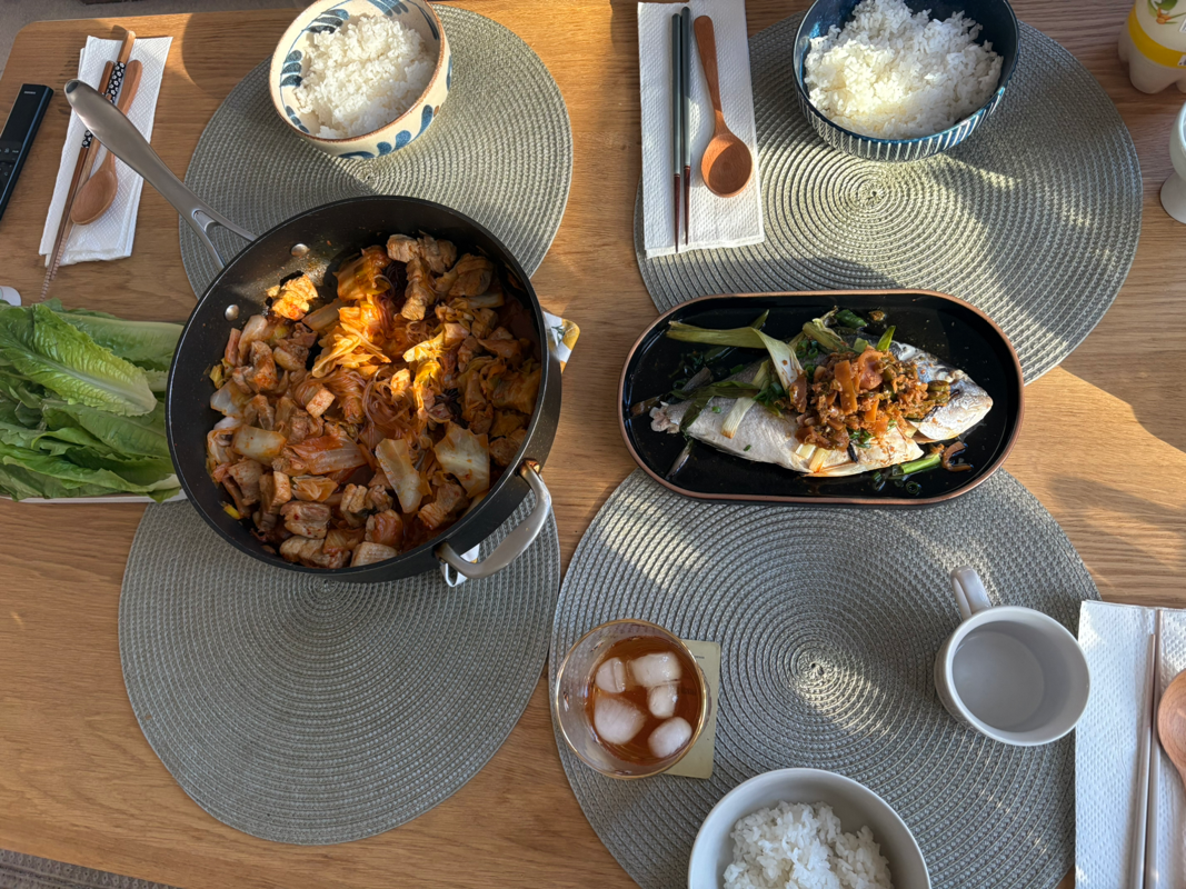 400g 돼지고기가 마트에서 5파운드인데 참나... 냉장고에 있던 샌드위치가 4파운드 넘는다.ㅠ 샌드위치 좋아하는 편인데 냉장고 샌드위치는 별로 맛이 없단 말이요! 저번에 아시안 마트 구경갔다가 1+1 하길래 김치를 사왔는데, 김치봉투가 부풀길래 빨리 소비할 생각으로 돼지고기를 사왔다. 사실,, 점심에 빵만 먹었더니 짭짤한 고기가 먹고 싶었다. 친구는 생선요리 하길래 둘다해서 거하게 잘 먹었다! 호호호~