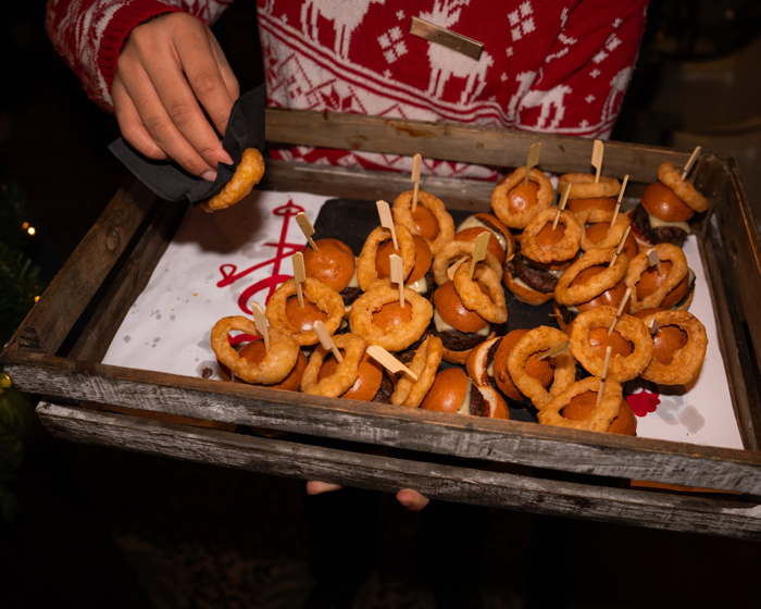 와인, 맥주, 음료 등등 마실 것들을이 제공되고 만나는 사람들끼리 스몰토크하며 술마시며 시작한다. 그리고 1~2시간 정도 좀 지나다보면 핑거푸드를 가지고 한번씩 돌아다니며 하나 둘 먹을 음식이 제공된다. (크리스마스 파티는 회사 행사이므로 술, 음식은 무료다. 다른 회사를 다녀보지 않아 모르지만 보통 회식이라는 개념이 없는데, 종종 업무 이후에 회사사람들과 펍에 갈때는 대부분 자기가 돈 내고 사먹는다.)