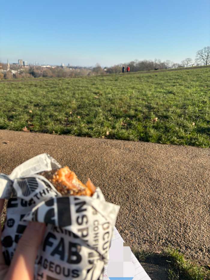 이런 저런 이슈로 조금 생각한 것 보다 늦어졌으나 도착한 햄스테드히스는 너무 좋았다. 버스 내리자마자 있는 B베이글에서 좋아하는 크림치즈베이글과 커피를 사들고 산책에 나섰다. 동네도 너무 예쁘고, 강아지랑 산책하는 가족, 연인들이 많았다. 무엇보다 진흙에서 뒹구는 강아지들이 매우 행복해보였다.