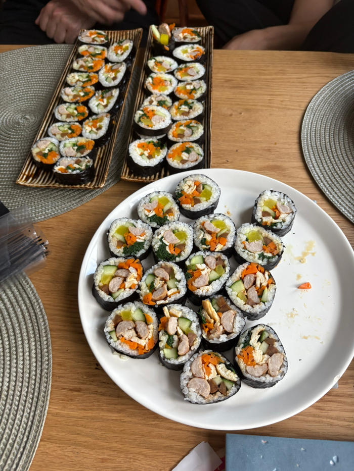 저녁에 같이 김밥 만들기로 해서 저녁은 김밥을 거하게 만들었다. 여기서 지내면서 밥을 한국에서보다 더 많이 먹는 듯 싶다.ㅎㅎㅎ 돌아가면서 말고, 썰고 해서 거의 10줄도 더 만들었다... 다들 잘 먹고 좋아해서 다행이야!
