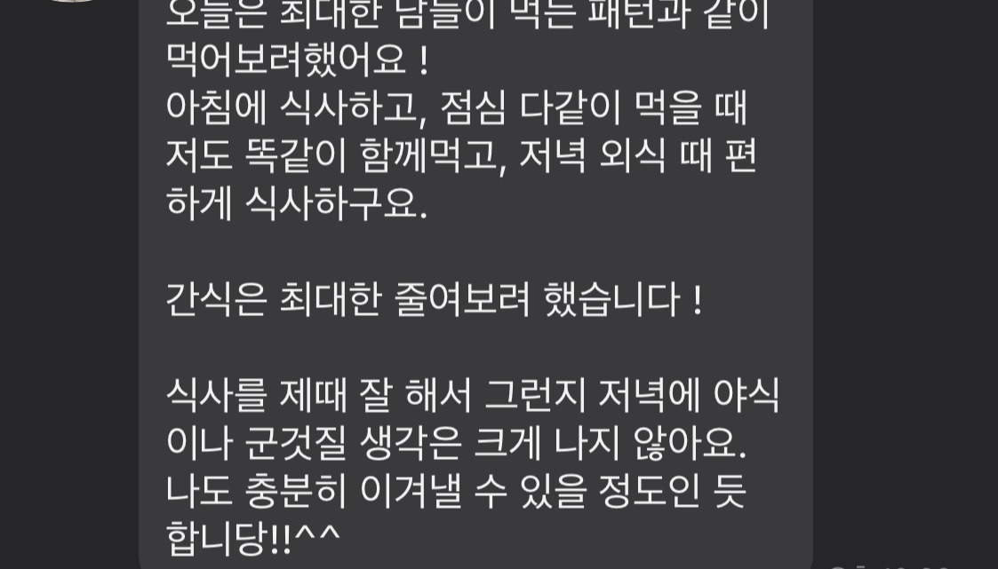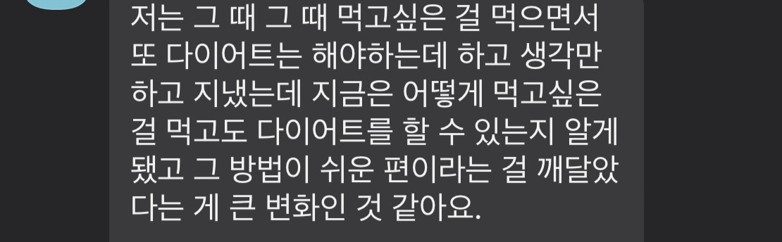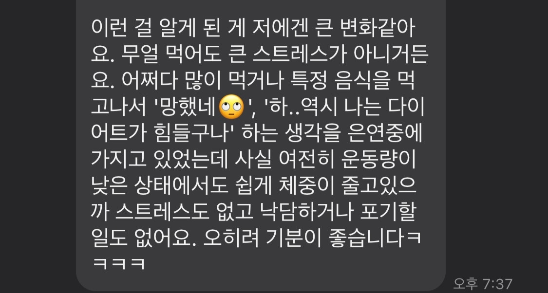 한 번의 요요를 겪은 뒤로는 체중의 큰 변화 없이 유지하고 있고, 다이어트 식단은 식탁에서 사라진지 오래되었습니다. 제가 닭 가슴살 샐러드를 먹는다면 정말 먹고 싶어서 먹는 겁니다. 운동은 제가 좋아하는 걸로 매일 적당한 시간을 내서 하루의 활력을 충전합니다. 매끼 신선한 음식을 먹지만 때로는 배달음식과 야식, 술도 먹습니다. 가족이나 친구들과의 식사 자리에서는 메뉴가 무엇이든 맛있게 먹고, 급하게 는 체중은 최대한 빨리 원상 복귀를 시킵니다. 이 모든 게 너무 쉽고 편안해졌습니다.