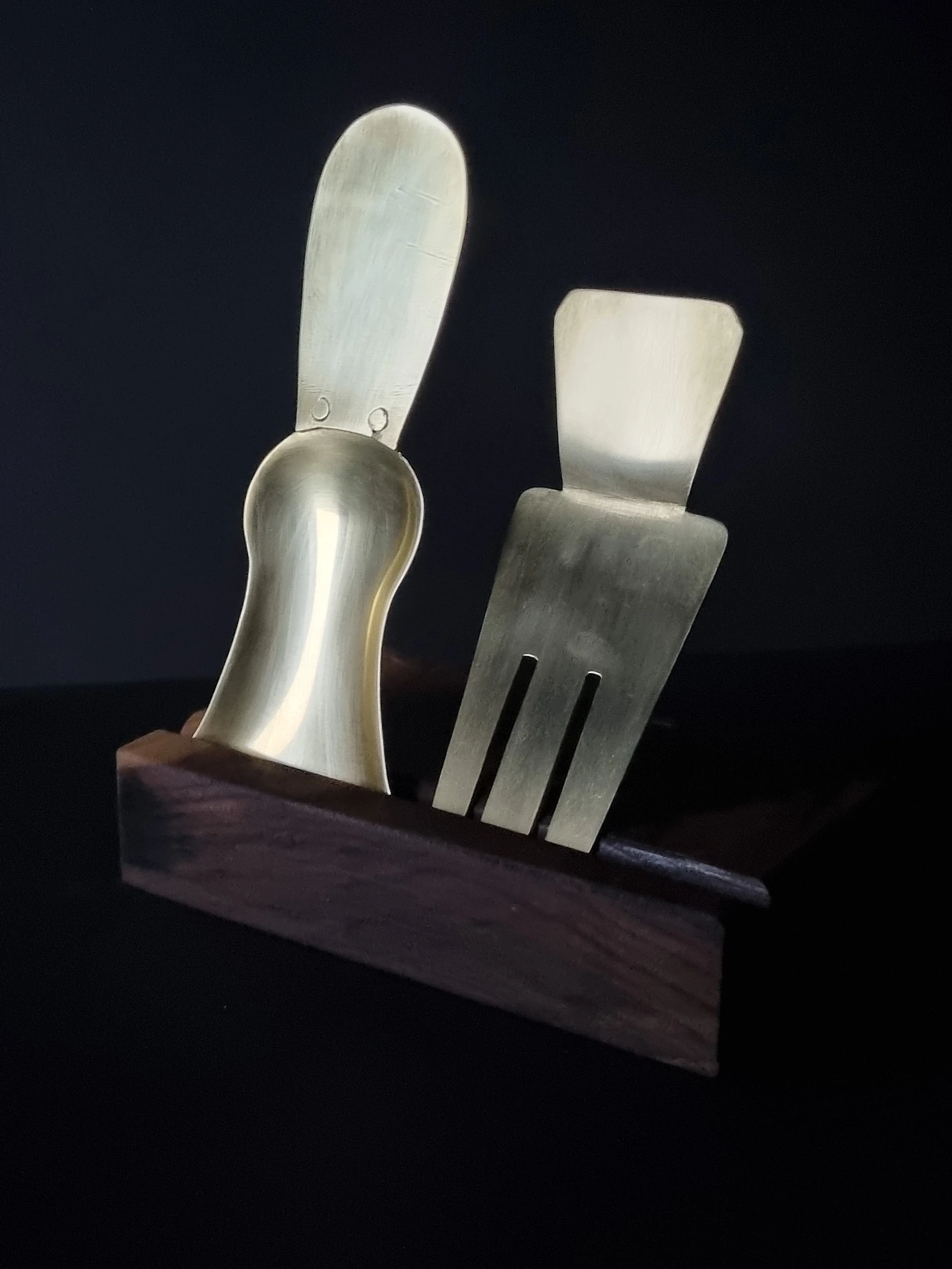 수저 세트 , 황동 머리를 올린 신부의 모습과 약간 턱시도를 입은 신랑의 모습을 담아보았다. 캐릭터를 묘사할 때 특징을 과장해서 표현하곤 한다. 신부의 경우 머리의 비례를 크고 길쭉하게 한 점에서 잘 사용했지만 신랑의 경우 그런 임팩트가 강하지 않은 점이 아쉽다.