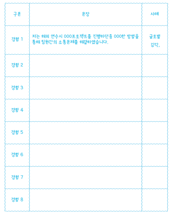 하지만 작은 경험일지라도 그 안에서 얻을 수 있는 교훈, 깨달음 그리고 가치관 등에 의미를 부여하시면 됩니다. 경험은 사실대로 작성하되 허황한 거짓말이 포함되어 있으면 안 됩니다.