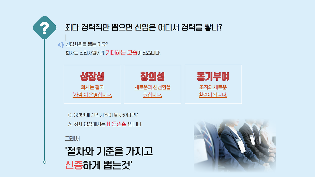 세 번째로 동기부여입니다. 신입사원이 새로운 것을 시도한다거나 오래된 고정관념을 깨는 역할을 할 수가 있습니다. 신입사원이 들어옴으로써 팀이나 회사에 새로운 동기부여를 제공해 주기 때문에 그렇습니다. 그래서 회사는 당장에 회사에 크게 도움이 안 될지라도 이런 부분들을 기대하고 절차와 기준을 가지고 매우 매우 신중하게 신입사원을 뽑는 겁니다.
