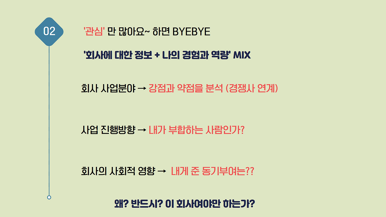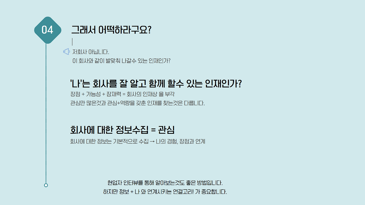 나는 지원한 회사와 같이 성장하고 맞춰갈 수 있는 인재인지가 가장 설득력 있는 근거가 되는 겁니다. 그래서 현업자 인터뷰를 통해서 알아보는 것도 굉장히 중요하지만, 다시 강조해서 말하자면 회사 정보수집을 통해 알게 된 내용과 나의 경험의 장점을 연결하는 포인트가 중요합니다.