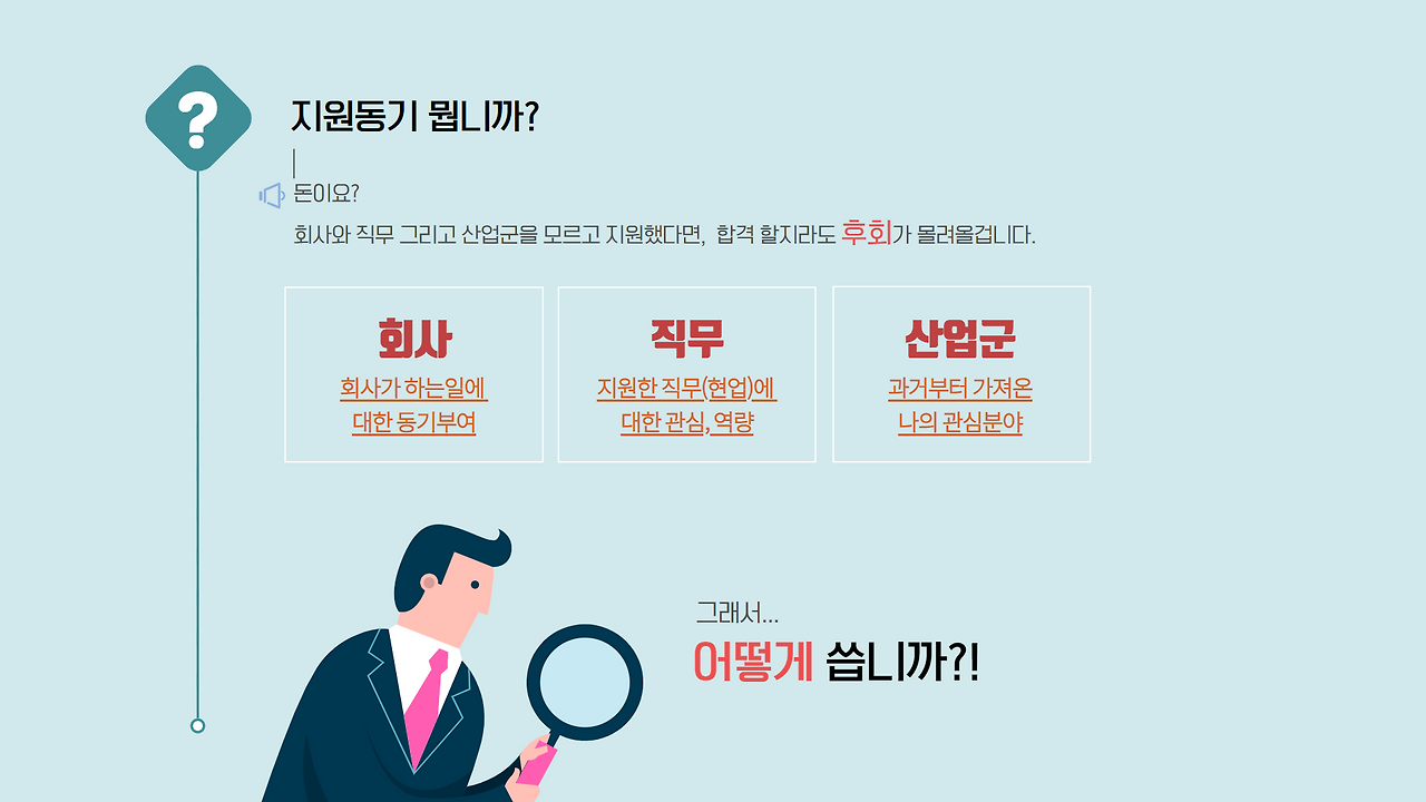 동기부여 부분을 쉽게 말해 ‘00 직무에 관심 많아요’, ‘회사를 좋아해요.’라는 식의 감정적인 부분으로 접근하지 마시고 조금도 논리적으로 접근을 하면 좋겠습니다.