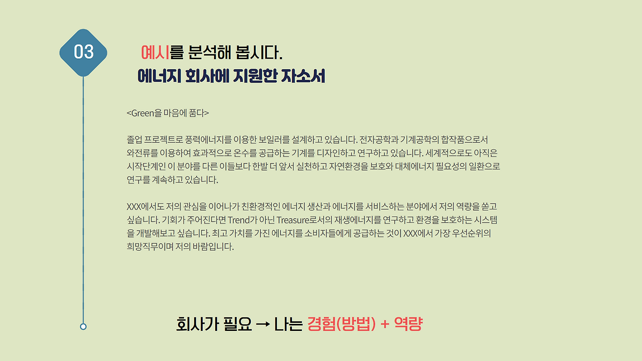 회사의 사업 분야가 가진 강점과 경쟁사와의 차별점을 알아보시고 사업은 어떻게 진행되고 있는지, 본인 역량이 사업에 맞춰갈 수 있는지, 회사의 사회적 영향이 내게 어떤 동기부여를 주었는지에 대한 명확한 답변이 필요합니다. 이런 부분들이 왜 이 회사이어야만 하는지에 대한 근거가 되는 겁니다. 여기에 맞춰서 나의 경험 역량을 잘 혼합시키는 것이 중요합니다.