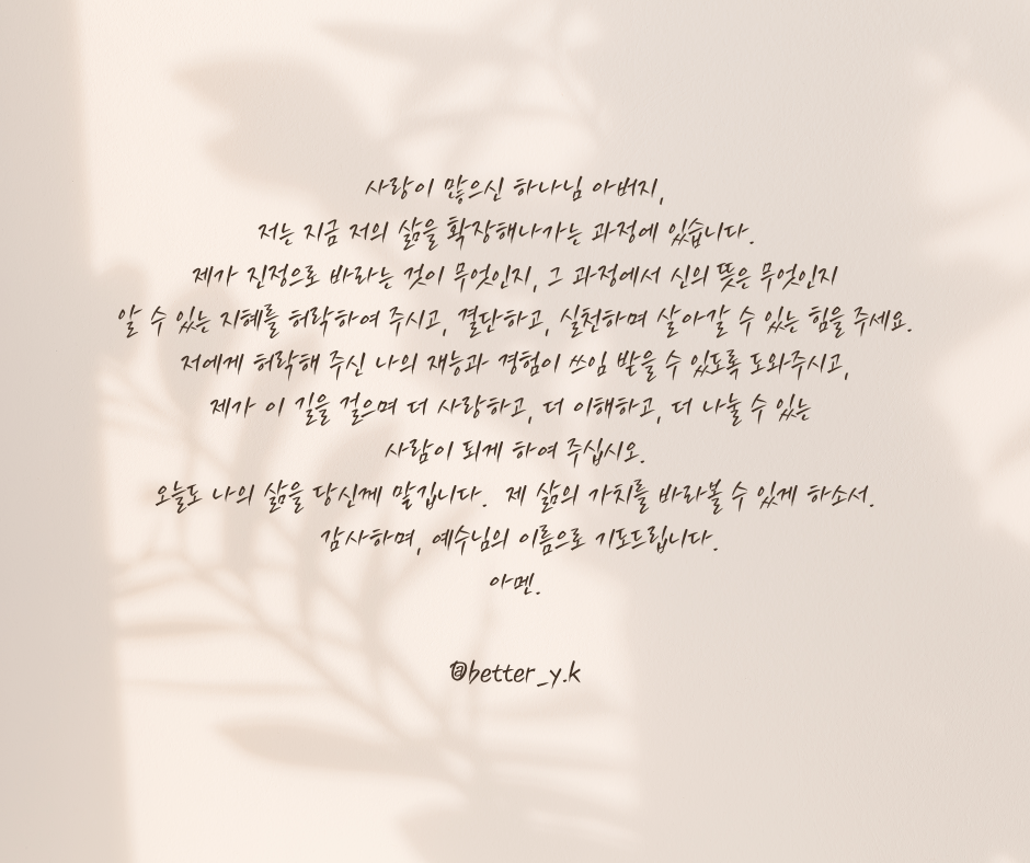 하루라는 시간은 생각보다 빠르게 지나가고, 그 안에서 나는 쉽게 흔들리기도 한다. 하지만 이 기도문을 읽고 시작한 날은, 작은 일에도 중심을 잃지 않으려고 애쓰는 나를 발견하게 된다.