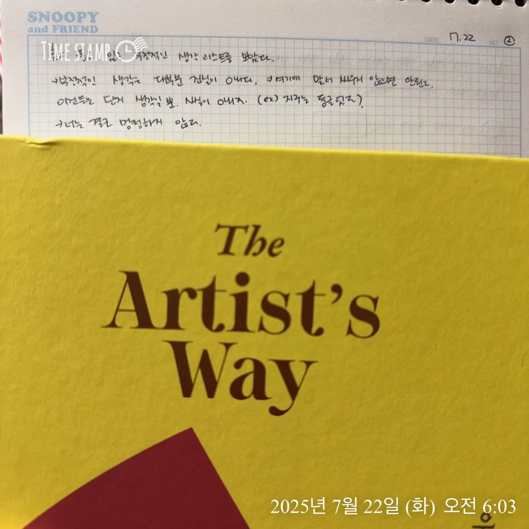 오늘 아침 『아티스트웨이』 1주 차 두 번째 과제를 끝냈다. "내가 창조적인 사람이 될 수 없는 이유" 20가지 리스트를 읽으며 몇몇 문장에서 나도 모르게 멈칫했다.