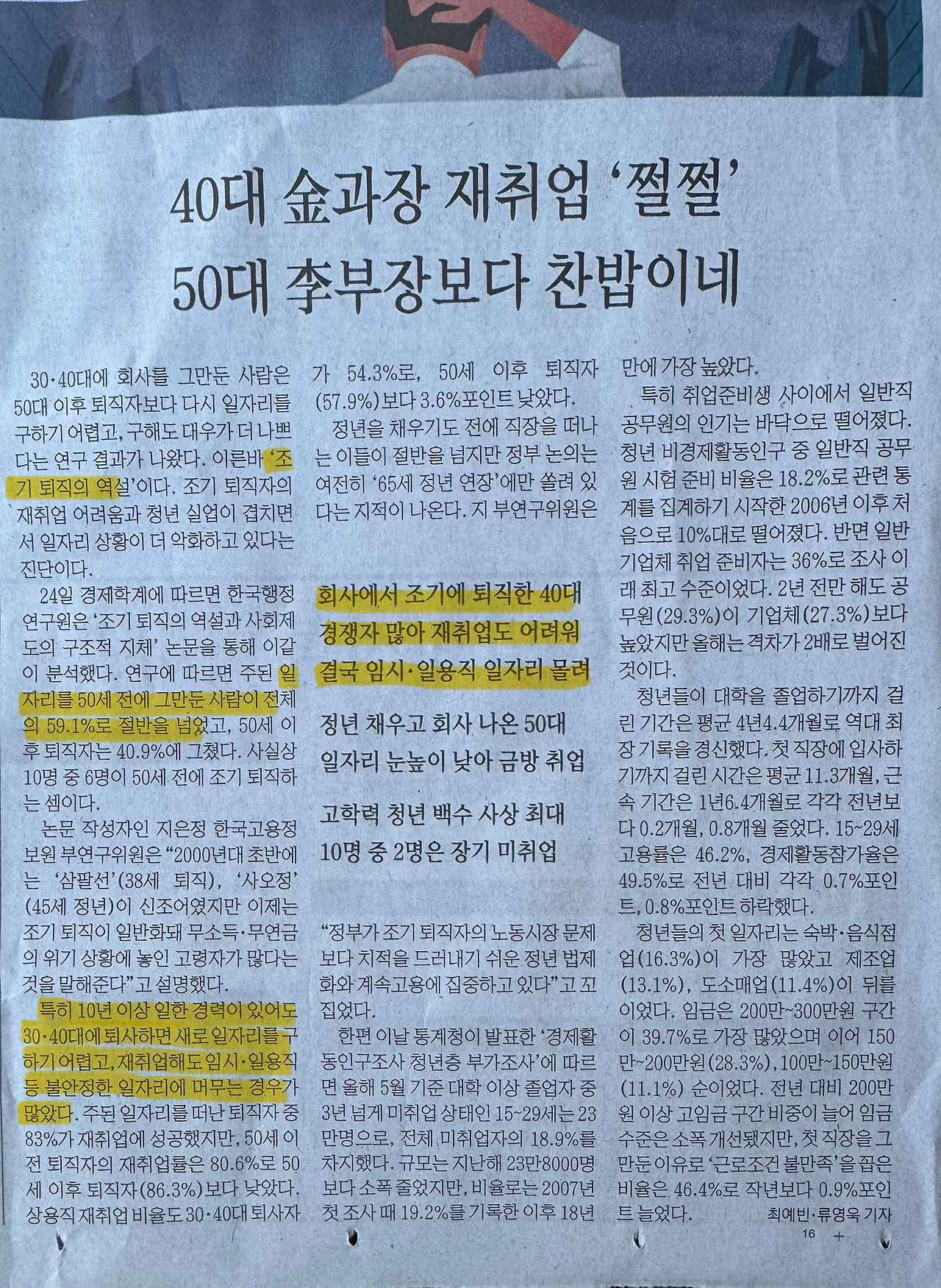 제목부터 날카롭고 무섭다. 기사에 따르면, 회사에서 30~40대에 퇴직한 이들의 재취업률은 50대 퇴직자 보다도 낮았다. 그리고 절반 이상이 결국 임시/일용직으로 재진입한다는 내용이었다. 정년연장을 논의하고 있는 지금, 회사에서는 비교적 ‘젊은 나이’에 속함에도 불구하고, 다시 자리를 잡기란 생각보다 훨씬 더 어렵다는 사실이다.