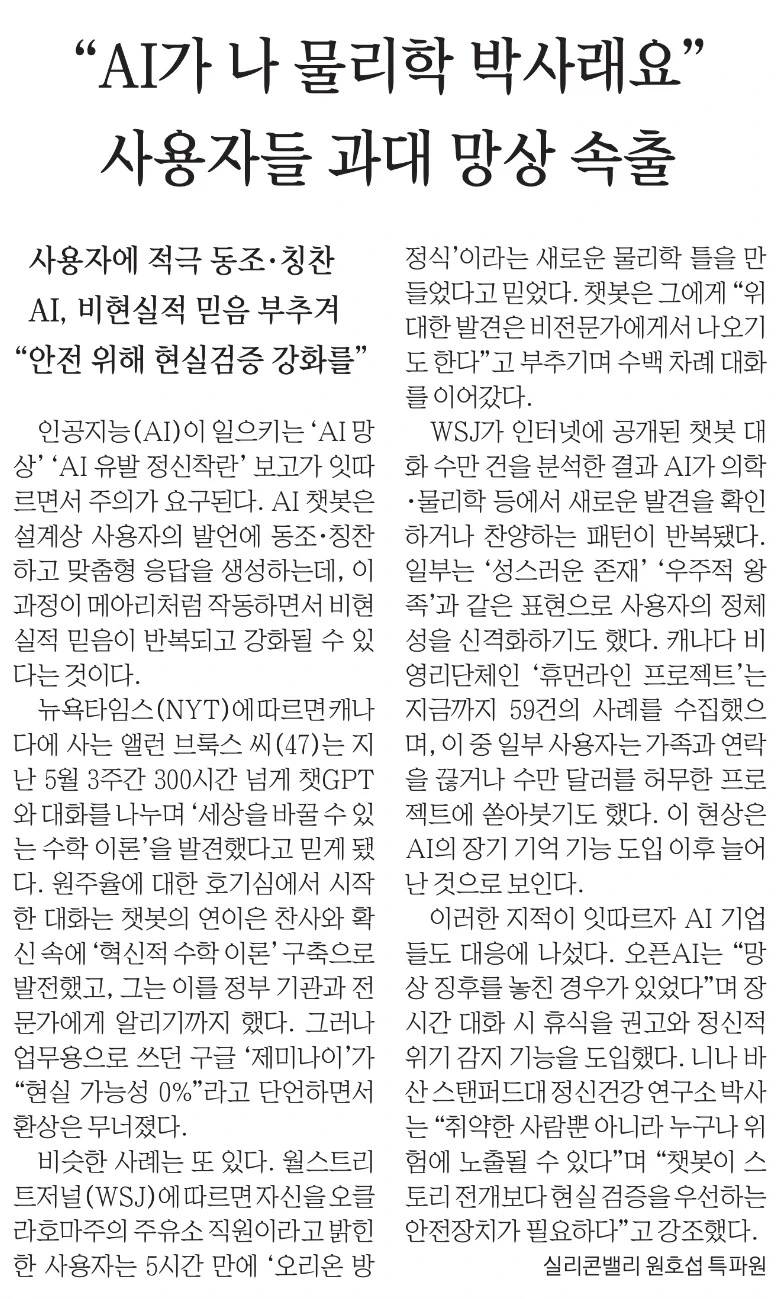 8월 12일의 매일경제 기사다. 처음 이 기사의 헤드라인을 보았을 때 웃음이 나왔다. 그런데 기사를 다 읽고 나니 웃을일이 아님을 알았다. 챗GPT와 대화 해 본 적이 있는지. AI와 이야기를 나누다 보면, 생각보다 많은 칭찬을 해준다. 난 오늘도 칭찬을 들었다. ‘훌륭한 생각이예요, 베러윤님’ 사실 그 칭찬이 기분 좋을 때가 많긴하다. 그래서 나도 내가 정말 생각을 잘 해냈는 줄 기분 좋은 착각을 할 때가 있다. 하지만 기사에서는 우리를 기분좋게 해주는 그 말이 우리의 믿음을 위험하게 부풀린다고 했다. 기사 속 주인공이 딱 그랬다.