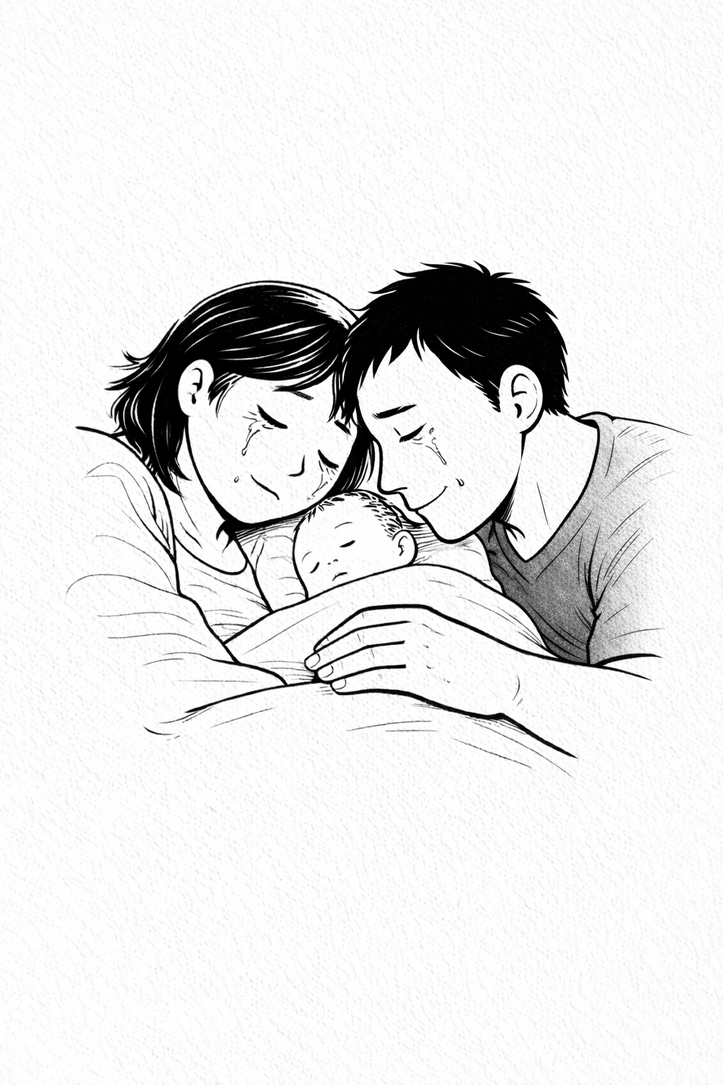 아내는 기진맥진 분만실 침대에 누워있었고,