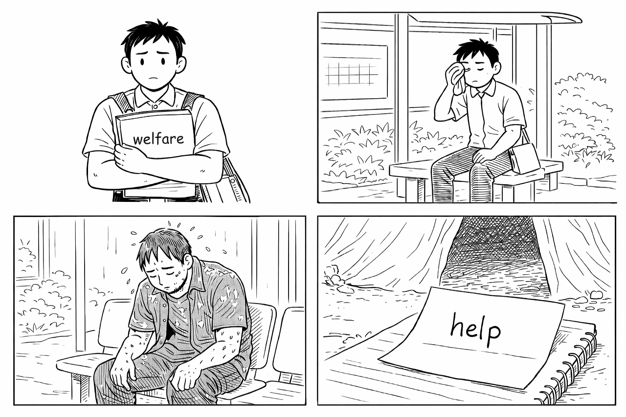 "버스정류장에 낯선 텐트가 있어요. 누가 살고 있는 것 같은데...."