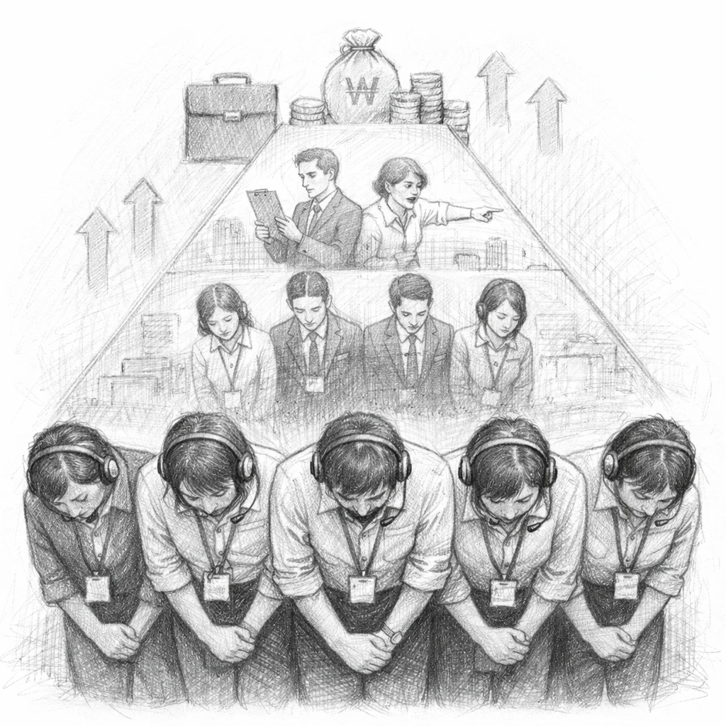 규정과 기준은 이미 위에서 정해져 있고, 감정노동자는 그 결과를 설명하고 전달하는 역할을 맡는다.