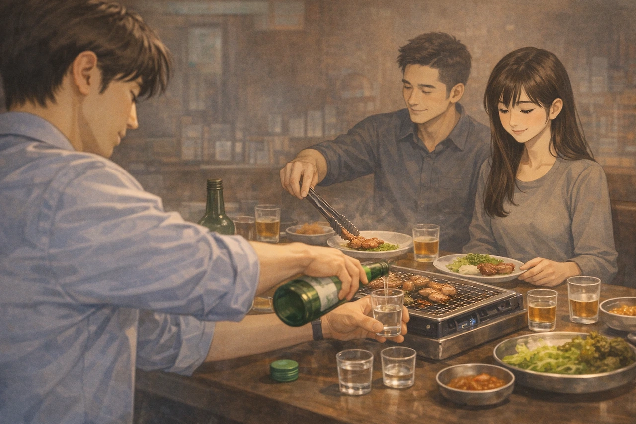 먼저 부장이 자리를 잡고, 차장이 옆을 채운다. 관리자들의 옆자리, 신입사원들의 자리와 부장 사이의 자리가 과장인 나의 위치다. 딸깍, 소주병 따는 소리가 들리면 부장의 건배사로 술자리가 시작된다. 잔이 부딪히는 소리가 크게 울렸다.