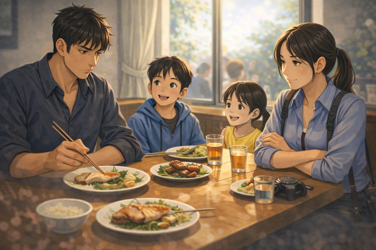 아내와 아이들이 자리를 잡고 있을 동안