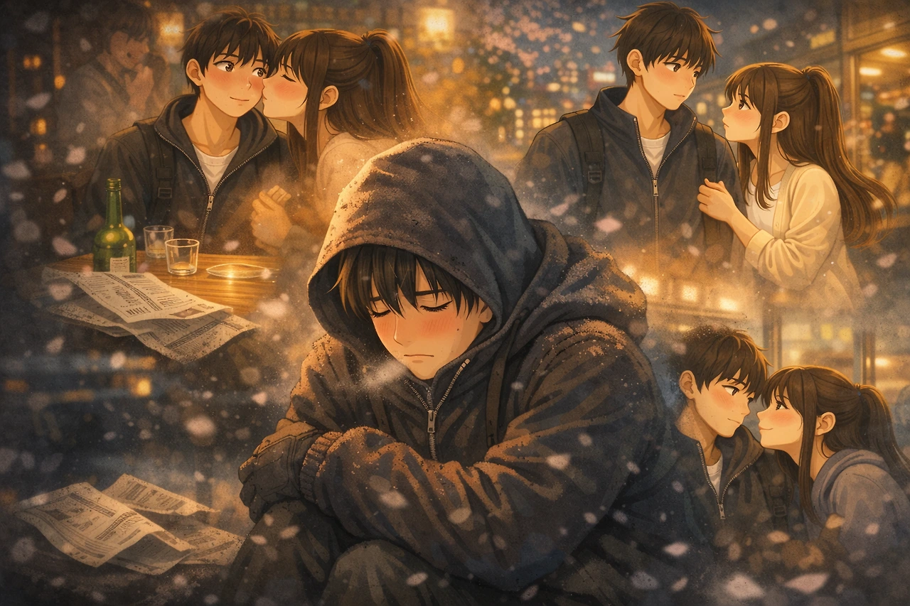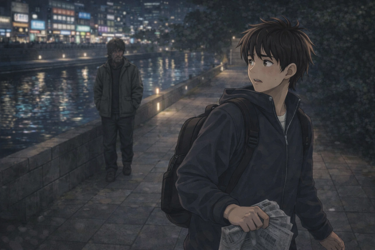 그날 밤에는 천 원짜리 신문지 한 장과 저 멀리 청계천의 네온사인만이 남아있었다.