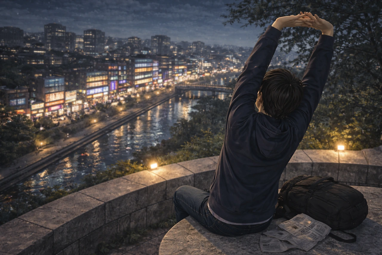 괜히 과장된 목소리로 크게 말했다. 나는 건너편을 신경 쓰지 않는다는 듯 일어나 허리를 휘휘 돌려가며 발을 내디뎠다. 그리곤 뒤도 돌아보지 않고 다소 빠른 걸음으로 청계천을 벗어났다.