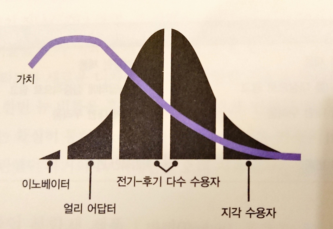 제프 무어의 아이디어 확산 곡선 및 세스 고딘의 가치 곡선 (출처 : 책 - 보랏빛 소가 온다 )