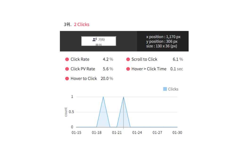 그런데 여기에서 눈에 보이는 것이 있었습니다. 바로 클릭 3순위의 ‘기타 문의하기’ CTA인데요, 현재 이 순위는 문의 페이지에서 전환된 사용자들의 클릭 순위입니다. 하지만 다시 문의할 수 있는 CTA를 사용자가 클릭하고 있었습니다.