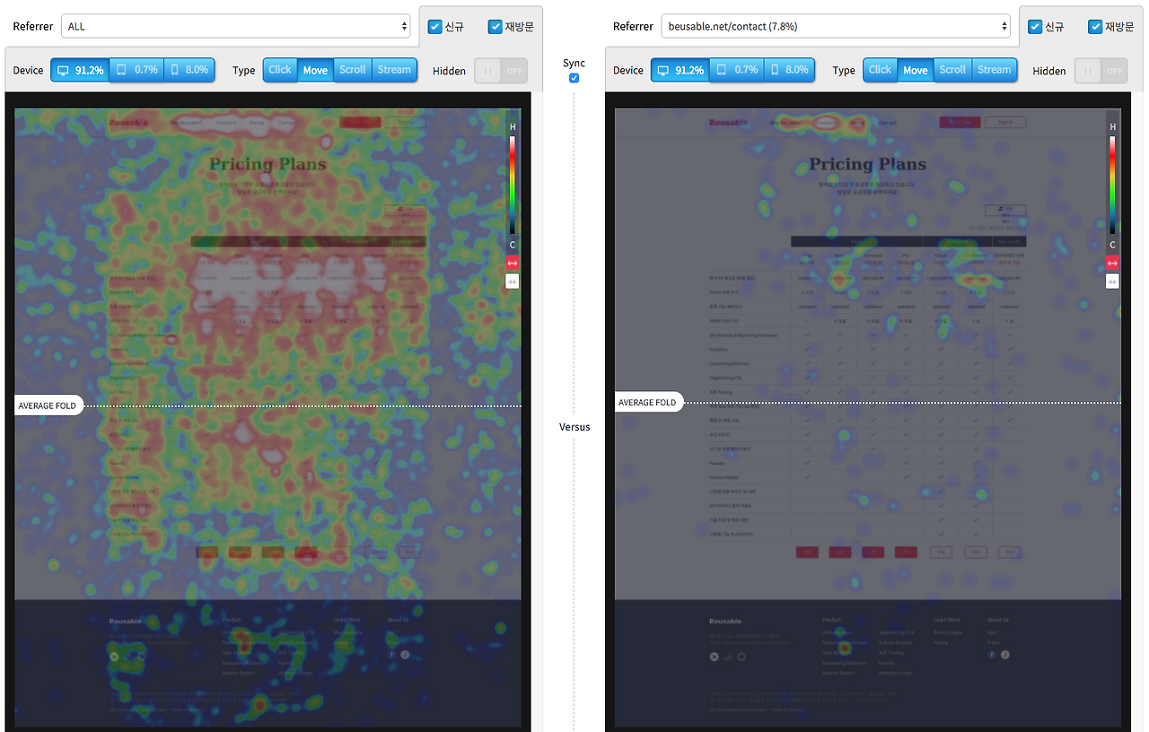 Comparing Referrers 기능으로 플랜별 가격, 제공 기능 등에 대한 정보를 알 수 있는 Pricing 페이지의 전체 PV와 Contact 유입 PV 무브 히트맵을 비교해보았습니다.